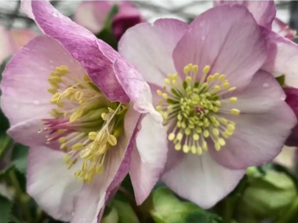 Christrose 'HGC Winter Ballet Liara' - gehört zur Serie Winter Ballet aus dem Programm Helleborus Gold Collection der Gärtnerei Heuger. Die interspezifische Herkunft aus der Kreuzung von Helleborus niger und Helleborus × hybridus äußert sich in einer frühen Blüte und gleichzeitig einem robusten, immergrünen Laub. Die Pflanze bildet einen kompakten Horst mit ledrigen, handförmig geteilten Blättern von dunkelgrüner Farbe, meist 30–40 cm hoch und 35–45 cm breit. Von Dezember bis April wachsen über den Blättern kräftige Stiele, die große, aufrechte, schalenförmige Blüten tragen. Liara wird für ihre zweifarbigen Blütenblätter geschätzt, die Basis ist cremeweiß bis hellrosa, die Ränder und Adern dunkeln zu einem satteren Rosa nach, zur Mitte hin verdichtet sich die Farbe und erzeugt eine feine Zeichnung. In der Mitte erheben sich gelbe Staubgefäße, die an wärmeren Tagen Pollen für Bestäuber liefern. Die Blüten eignen sich zum Schnitt und für winterliche Arrangements, da sie Form und Farbe lange behalten. In der Komposition wirkt sie natürlich mit Farnen, Funkien, Lungenkraut, Brunnera, Purpurglöckchen und Frühjahrszwiebelblumen. Die Pflanze ist giftig und kann bei der Handhabung die Haut reizen.