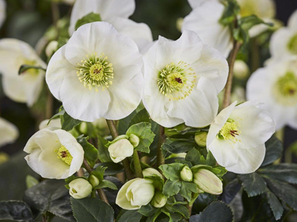 Christrose 'HGC Winter Ballet Lisann' - eine bezaubernde Sorte der Christrose, die im Winter und frühen Frühling blüht, wenn viele andere Pflanzen noch auf ihre Wachstumsperiode warten. Diese Sorte zeichnet sich durch wunderschöne reinweiße Blüten aus, die in der Mitte einen zarten grünlichen Schimmer und an den Rändern eine rosa Färbung aufweisen können, was den Blüten eine zarte Eleganz verleiht. Die Blüten sind groß, schalenförmig und auffällig, mit dunkelgrünen Blättern, die das ganze Jahr über attraktiv bleiben. Sie ist beliebt für ihre Widerstandsfähigkeit und ihre Fähigkeit, auch bei kaltem Wetter zu blühen, was sie zu einer idealen Pflanze für Wintergärten und Kübel macht. Diese Christrose bringt nicht nur Farbe in die Wintermonate, sondern ist dank ihrer beständigen Natur auch ein zuverlässiges und langlebiges Element in Gartenbeeten.