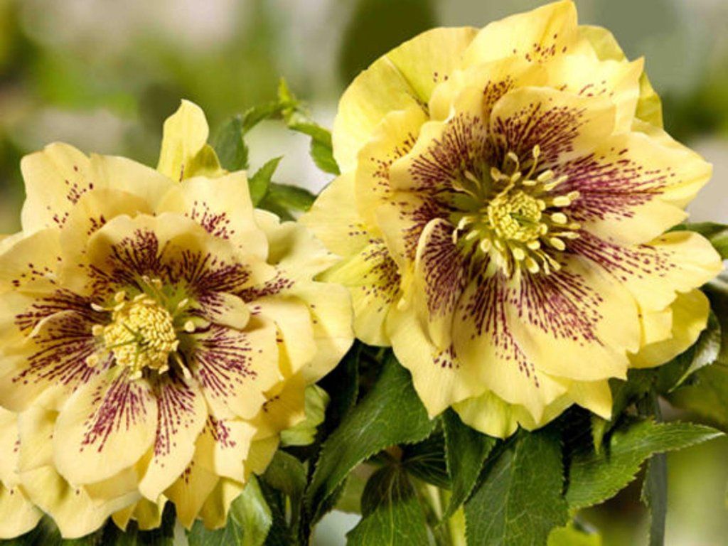 Christrose 'SP Abby' - ein absolut einzigartig gefärbter Kultivar eines immergrünen, kleineren Strauchs. Sie erreicht eine Höhe von etwa 40 cm. Im Laufe des Januars beginnen sich gelb gefärbte Blüten zu entwickeln, mit deutlicher, himbeerfarbener Äderung und einem Rand der Blütenblätter. Die Blütenfarbe kontrastiert wunderschön mit den dunkelgrünen, glänzenden Blättern. Diese wunderschöne Winterkönigin sollte in keinem Garten fehlen.