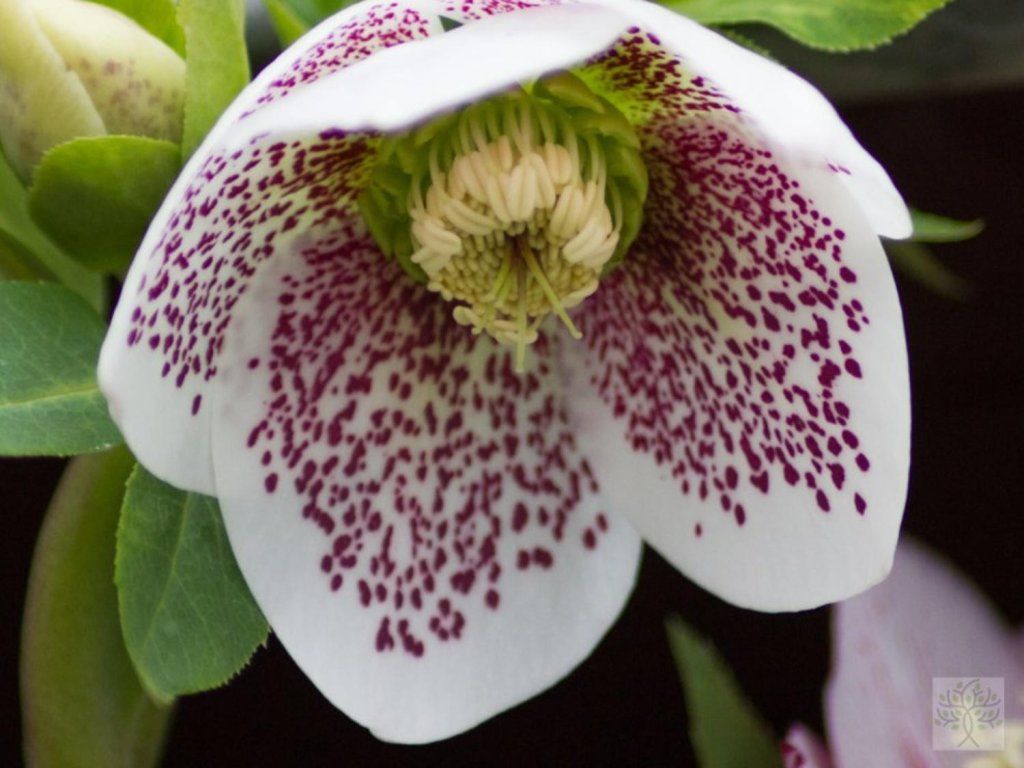 Christrose 'SP Conny' - eine reichblühende Sorte mit aufrechten Stielen, die eine Höhe von etwa 25 - 35 cm erreicht. Große Blüten haben einen Durchmesser von bis zu 5 cm. Sie sind weiß mit deutlicher weinroter Sprenkelung. Sie blüht lange, wenn der Winter mild ist, erscheinen die Blüten bereits Mitte Januar und die Blütezeit dauert bis März an. Die Blätter sind ledrig, immergrün und tiefgrün. Sie ist schön und pflegeleicht. Geeignet für Gruppenpflanzungen. Sie kommt gut in Kombination mit Kuhschellen, Lungenkraut und Zwiebelblumen zur Geltung. Sie wird in Behältern an Eingangstüren und auf Terrassen sehr dekorativ wirken.