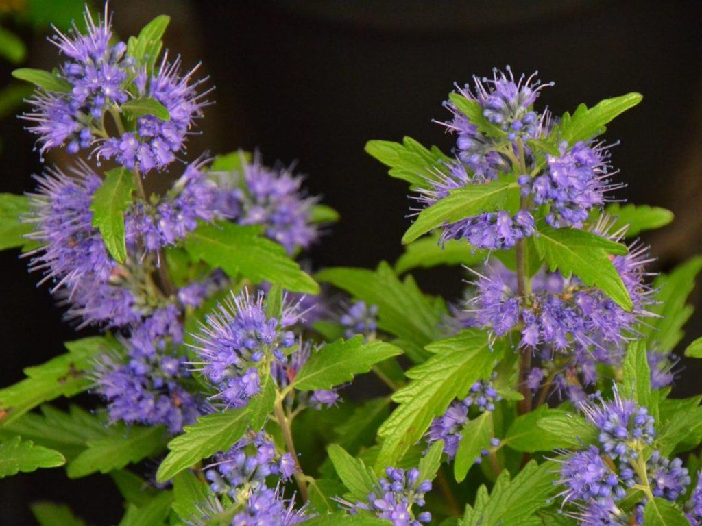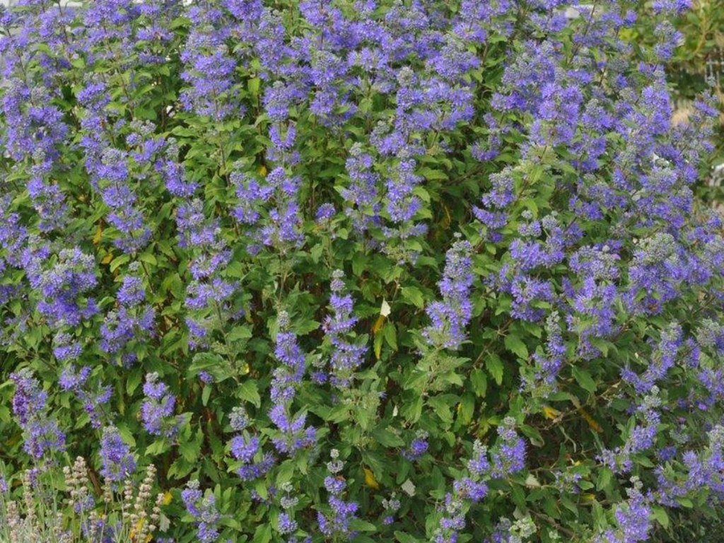 Caryopteris x clandonensis 'Blue Balloon' - ein mittelgroßer, gut verzweigter Strauch, der durch seine bunten Blüten auffällt. Er erreicht eine Höhe von 1-1,3 m bei einer Breite von 0,4-0,8 m. Von Anfang August bis Ende September dominieren auf dem Strauch deutlich kugelförmige, ballonförmige Blütenstände in leuchtend blauer Farbe. Die Blätter sind lanzettlich und haben eine silbrig-graue Farbe. Der Strauch ist pflegeleicht; er ist auch sehr attraktiv für bestäubende Insekten.