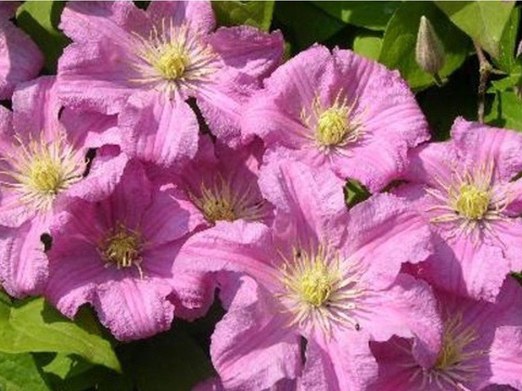 Clematis 'Comtesse de Bouchaud' - gehört zu den klassischen großblumigen Clematis mit langer Tradition in europäischen Gärten. Die Sorte entstand Anfang des 20. Jahrhunderts in Frankreich und wird bis heute als zuverlässiger rosafarbener Akzent auf Pergolen, Zäunen und Drahtkonstruktionen verwendet. Die Pflanze bildet einen kletternden Strauch von 2,5–3 m Höhe mit mittelstarken, belaubten Trieben, die sich um Stützen winden. Die Blätter sind grün, oft dreiteilig, bleiben während der Saison gesund und bedecken die Struktur gut. Von Juni bis September trägt sie weit geöffnete Blüten mit einem Durchmesser von 10–15 cm, bestehend aus 6 bis 8 zartrosa Blütenblättern, die zur Mitte hin oft intensiver gefärbt sind. Die Staubgefäße sind gelb und bilden in Kombination mit den rosa Blütenblättern einen weichen, harmonischen Kontrast. Die Blüten erscheinen an neuen Trieben, daher gehört die Sorte zur Gruppe der Sommerblüher-Clematis, die stärkere Rückschnitte gut vertragen. In der Gartengestaltung eignet sie sich für Pergolen, an sonnigen Wänden, in Kombination mit Rosen, Spiersträuchern, Hortensien oder feineren Gräsern, wo die rosa Blüte den Ausdruck dunklerer Gehölze mildert. Gehört zur 3. Gruppe der Clematis, die ihren Schnitt bestimmt.