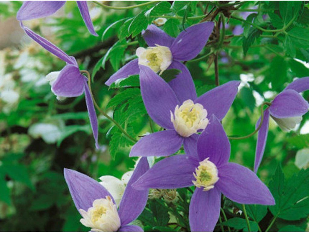 Clematis 'Frankie' - einer der am frühesten blühenden Clematis. Im ausgewachsenen Zustand erreicht sie eine Höhe von etwa 2,4 m und eine Breite von 1,5 m. Die Blüten sind himmelblau mit einem Hauch von Violett und mit auffälligen Staubgefäßen mit Staubbeuteln in der Mitte der Blüte, die gelblich-weiß gefärbt sind. Die Blätter haben eine frische grüne Farbe und fallen im Winter ab. Sie eignet sich hervorragend neben Terrassen oder anderen Stützen als Zierpflanze. Die Clematis ist insgesamt ein schönes Element für Gärten, sie bringt Farbe und ein einzigartiges Aussehen in jeden Garten. Er ist nicht anspruchsvoll im Anbau und hat sich dadurch zur Nummer eins unter den Kletter- und Blühpflanzen entwickelt. Wenn Sie also eine anspruchslose und widerstandsfähige Pflanze suchen, die auf den ersten Blick besticht, dann ist sie die beste Wahl.