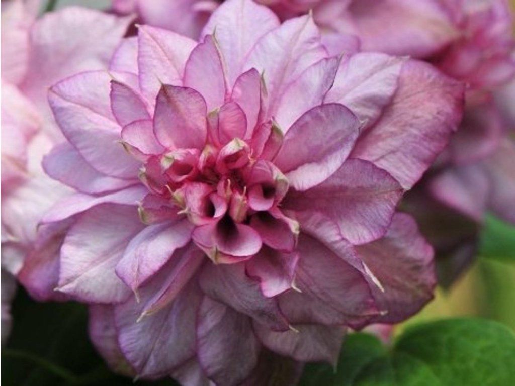 Clematis 'Innocent Glance' - eine lang blühende Sorte, die sich vor allem durch ihre großen und vollen Blüten auszeichnet. Sie sind blassrosa gefärbt. Eine wärmere rosafarbene Tönung ziert die Ränder der Blütenblätter. Die Blütezeit beginnt im Mai und dauert bis Juli, gefolgt von einer erneuten Blüte von August bis September. So wird er unsere Gärten vom Frühling bis zum frühen Herbst mit seinen wunderschönen Blüten schmücken. Die Staubgefäße sind hellgelb. Die Sorte erreicht eine Höhe von etwa 2 m. Nach der Blüte bilden sich flaumige Samenstände, die die Pflanze ebenfalls schmücken. Die Blätter sind tiefgrün, dreilappig und fallen im Winter ab. Gehört zur 2. Schnittgruppe der Waldreben. Clematis sollten auf verschiedenen Arten von Stützen angebaut werden, z. B. an Pavillons, Gittern, Stöcken, Pergolen oder anderen Stützen. Dank seiner Anspruchslosigkeit ist die Clematis zur Nummer eins unter den blühenden Kletterpflanzen geworden.