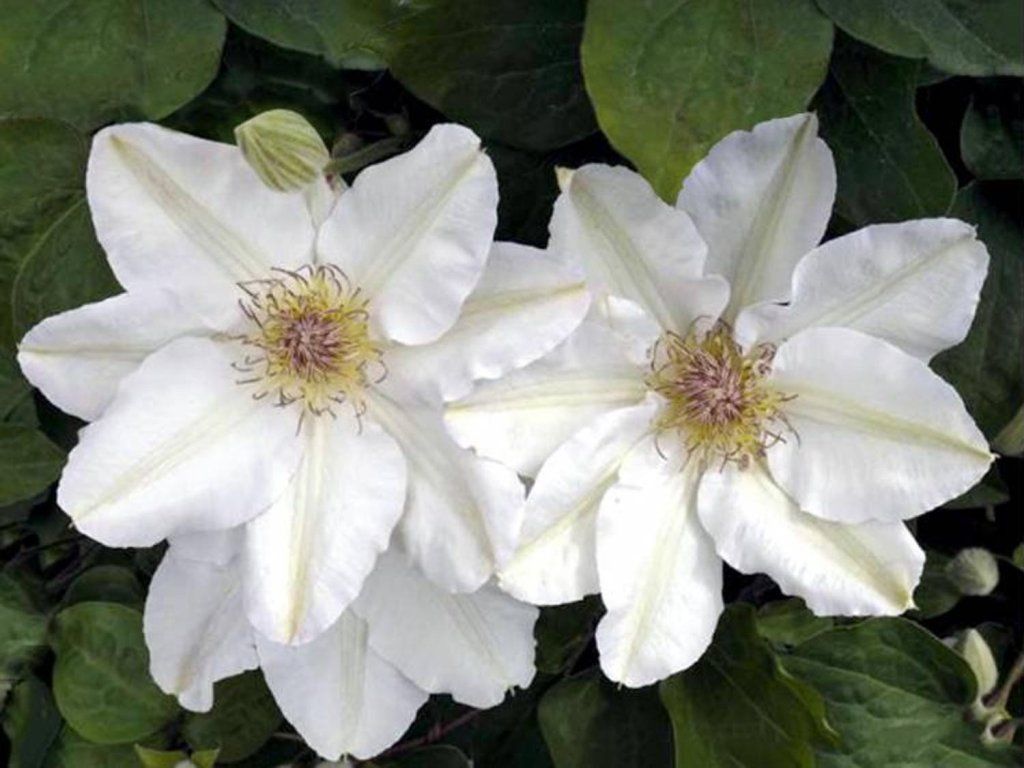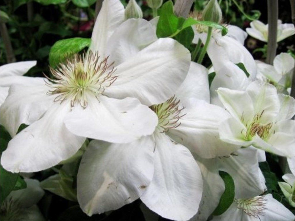 Clematis 'Jerzy Popieluszko' - eine elegante Sorte mit schneeweißen Blüten, dies ist eine polnische großblütige Clematis, gezüchtet von Dr. Ing. Szczepan Marczyński zu Ehren des polnischen Priesters Jerzy Popiełuszek. Im Garten bildet sie eine kompakte, sommergrüne Kletterpflanze von etwa 1,5–2 m Höhe und etwa 1–1,5 m Breite, je nach Standort und Rankhilfe. Die Triebe sind dünner, biegsam und die Blattstiele haften an der Stütze, sodass die Pflanze leicht an Spalieren, niedrigeren Pergolen, Pfählen oder Ästen von Sträuchern und kleineren Bäumen emporwächst. Die Blätter sind grün, glatt, eiförmig bis elliptisch und bilden während der Vegetationsperiode eine dichte grüne Wand. Die auffälligste Verzierung sind die großen, seidig-weißen Blüten mit einem Durchmesser von etwa 13–15 cm, deren kaffeebraune Staubbeutel an weißen Staubfäden einen subtilen Kontrast zu den reinweißen Blütenblättern bilden. Einige Blüten können halbgefüllt sein, insbesondere an gut ausgereiften Trieben. Die Blütezeit ist lang, in der Regel sehr üppig von Mai bis Juli, und setzt sich dann in geringerem Maße bis Oktober fort. Die weiße Farbe der Blüten hebt sich deutlich vom dunklen Hintergrund aus Bäumen, Backsteinmauerwerk oder Clematis mit dunkelvioletten oder roten Blüten ab. Die Sorte eignet sich für kleine und mittelgroße Gärten, repräsentative Vorgärten und Kübel auf Terrassen, wo sie elegant aussieht und nicht überwuchert wirkt. Die Blüten locken bestäubende Insekten an, aber alle Teile der Pflanze sind giftig, wenn sie verzehrt werden. Gehört zur 2. Schnittgruppe der Clematis.
