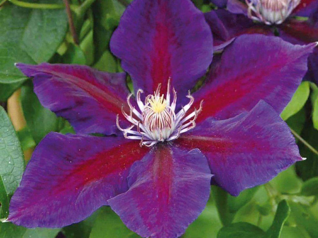 Clematis 'Julka' - eine polnische großblütige Sorte, die aus der Züchtung stammt, die auf auffällige, aber widerstandsfähige Kletterpflanzen für mitteleuropäische Bedingungen abzielt. Er erreicht eine Höhe von etwa 2 bis 2,5 m und eine Breite von ca. 1 m, daher eignet er sich sowohl für Pergolen und Maschendrahtzäune als auch für kleinere Gehölze, die er frei umranken kann. Die Blüten sind weit geöffnet, mit einem Durchmesser von etwa 12 bis 14 cm, mit 6 bis 8 samtig violetten Tepalen. Die Mitte jedes Tepalblatts wird durch einen weinrot bis purpurfarbenen Streifen betont, auf dem sich die Farbe zu den Rändern hin leicht aufhellt. Die Staubbeutel sind cremefarben bis hellgelb und bilden so einen deutlichen Kontrast zum dunkleren Hintergrund der Tepale. Die Blüte beginnt normalerweise im Juni, setzt sich im Juli fort und wiederholt sich bei geeignetem Standort und ausreichender Feuchtigkeit bis in den September. Als vertikales Element kommt er in gemischten Beeten mit Rosen, Spieren oder Hortensien gut zur Geltung, wo er den Raum zwischen den Gehölzen ausfüllt. Ein interessanter Effekt wird auch durch die Pflanzung an einer hellen Haus- oder Garagenwand erzielt, wo der dunkle Farbton der Blüten zur Geltung kommt. Dank seines mäßig kräftigen Wachstums eignet er sich auch für größere Kübel mit Rankhilfe auf Balkonen oder Terrassen. Gehört zur 2. Schnittgruppe der Clematis.