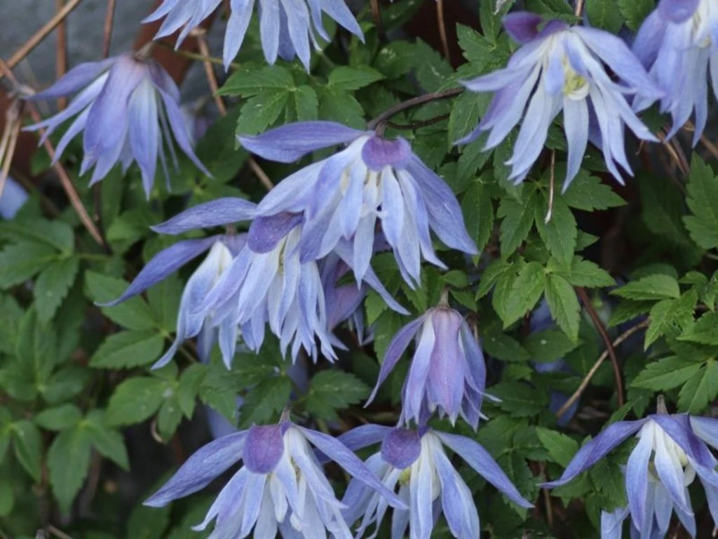 Clematis 'Maidwell Hall' - gehört zur Gruppe der Macropetala-Clematis, die aus den Bergregionen Nordchinas und der Mongolei stammen, wo sie in lichten Gebüschen und an Waldrändern wachsen. Diese botanische Verwandtschaft spiegelt sich in guter Winterhärte und der Fähigkeit wider, auch in kälteren Regionen gut zu gedeihen. Die Pflanze bildet dünne, biegsame Lianen, die normalerweise 2–3 m lang werden und sich mit Blattstielen an Stützen festhalten. Die Blätter sind unpaarig gefiedert, frischgrün und im Frühling leicht durchscheinend. Aus hängenden Knospen entwickeln sich im April und Mai glockenförmige bis halbgefüllte Blüten mit schmalen, blauvioletten Blütenblättern, die innen heller sind. Die Blüte ist früh und wird oft von einer leichten Bewegung der Blüten im Wind begleitet, was in Kombination mit Ziergehölzen sehr natürlich wirkt. In günstigen Jahren erscheint im Spätsommer erneut eine geringere Anzahl von Blüten. Der Kultivar lässt sich gut mit früh blühenden Rosen, Spieren oder Frühlingsgehölzen kombinieren und ergänzt diese durch einen vertikalen Akzent. Er eignet sich hervorragend neben Terrassen, Pergolen, Stöcken, Gittern oder anderen künstlich geschaffenen Stützen und bringt so Farbe und ein einzigartiges Aussehen in jeden Garten. Gehört zur 2. Schnittgruppe der Waldreben.