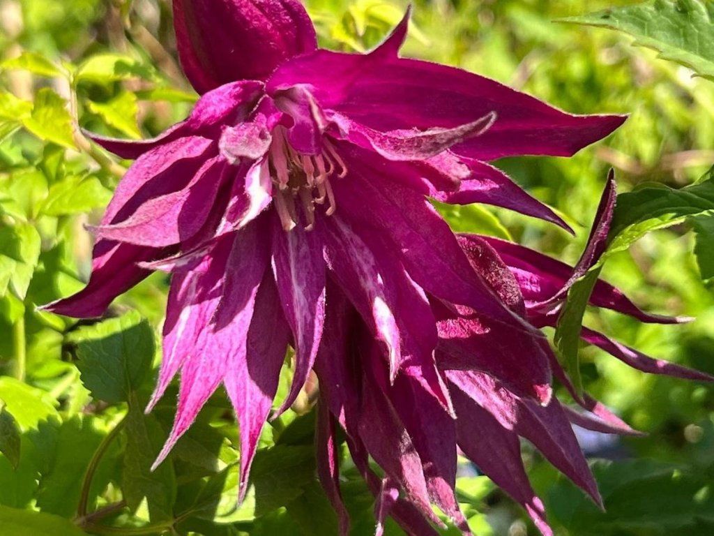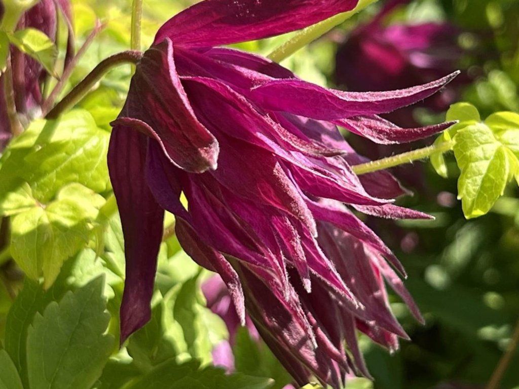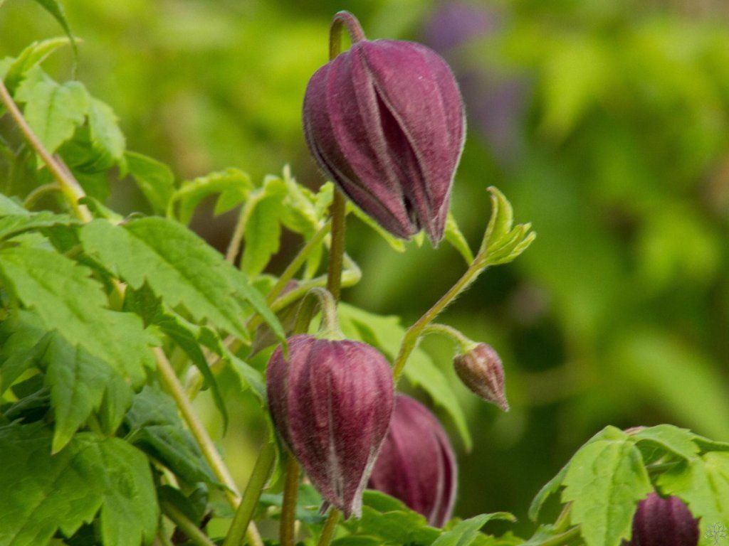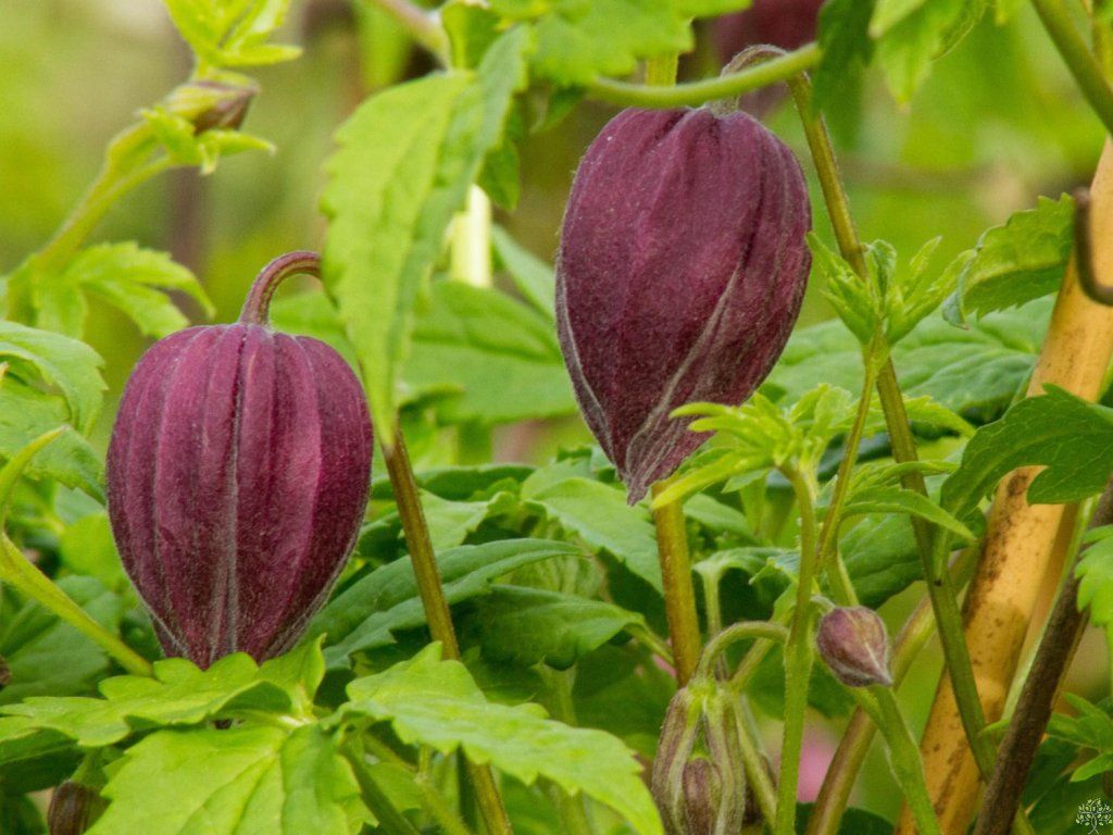 Clematis 'Purple Surprise' - gehört zu den neueren Sorten der Atragene-Gruppe, gezüchtet für eine tiefviolette Färbung der glockenförmigen Blüten und eine hohe Frostbeständigkeit. Ursprünglich stammt er von Arten aus Bergregionen ab, was sich in seiner Anspruchslosigkeit und guten Überwinterungsfähigkeit widerspiegelt. Er bildet leicht verholzende Triebe, meist 2–3 m lang, die sich mit Hilfe von Blattstielen an Rankhilfen festhalten und nach und nach einen locker verwobenen Bewuchs von etwa 1–1,5 m Breite aufbauen. Die Blätter sind unpaarig gefiedert, mittelgrün, manchmal mit feiner Textur, und bilden während der Saison einen luftigen, natürlich wirkenden Schleier. Die Blüten erscheinen hauptsächlich im Mai und Juni am älteren Holz, manchmal gefolgt von einer schwächeren Nachblüte im Juli oder August. Sie sind glockenförmig, mit 4–6 äußeren Kelchblättern in dunklen Violett- bis Weinrot-Tönen, der innere Teil der Blüte ist heller. Beim Aufblühen öffnen sich die Blüten leicht und enthüllen ein helleres Inneres, wodurch ein zarter zweifarbiger Effekt entsteht. Der Gesamteindruck der Pflanze wirkt gut in Kombination mit weißen Stauden, Frühlingszwiebeln und Sträuchern wie Spiersträuchern oder Viburnum. Die Pflanze ist beim Verzehr leicht giftig. Gehört zur 1. Schnittgruppe der Clematis.