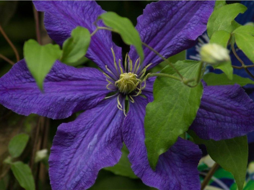 Clematis 'Rhapsody' - eine großblütige Hybride, bekannt für ihre satt blauvioletten Blüten und lange Blütezeit. Sie gehört zu den neueren Gartensorten, die die Blütengröße mit einer höheren Krankheitsresistenz verbinden. Die Blüten haben 6 bis 8 Blütenblätter, sind breit sternförmig und haben einen Durchmesser von etwa 10–12 cm. Die Farbe ist tief blauviolett, kann je nach Lichtintensität in Blautöne übergehen, mit hellen Staubgefäßen in der Mitte der Blüte als Kontrast. Die Hauptblütezeit ist im Juni und Juli, gefolgt von weiteren Blüten bis zum frühen Herbst. Die Triebe erreichen eine Länge von 2–2,5 m und bilden ein mitteldichtes Spalier, das sich für kleinere Pergolen, Spaliergerüste oder Drahtzäune eignet. Interessant ist die Kombination mit Rosen, insbesondere weißen und rosa Sorten, wo die blauviolette Blütenfarbe die zarten Pastelltöne benachbarter Pflanzen hervorhebt. Die Blätter sind grün, meist dreiteilig, leicht glänzend. Die Blüten können auch kurzzeitig für kleinere Vasen geschnitten werden, wo ihre Farbe zur Geltung kommt. Diese Sorte sollte in Ihrem Garten auf keinen Fall fehlen. Gehört zur 3. Gruppe der Clematis, die ihren Schnitt bestimmt.