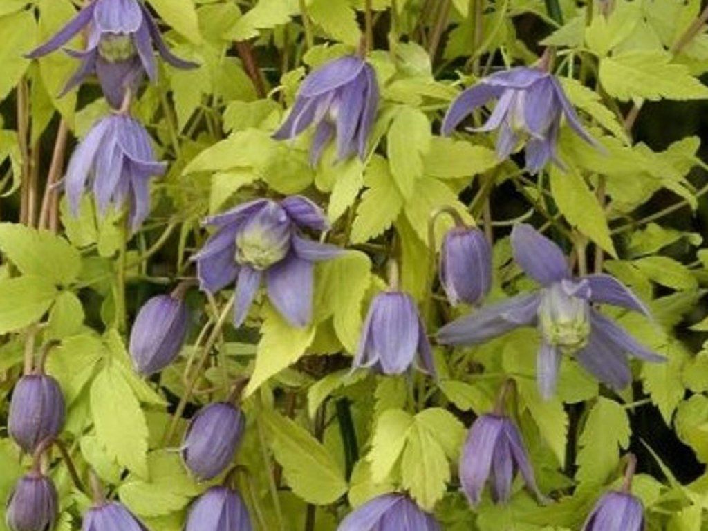 Clematis 'Stolwijk Gold' - erste Sorte mit goldgelben, zahlreichen Blättern. Mit ihnen kontrastieren die glockenförmigen, weit geöffneten Blüten, die aus 4 - 8 lanzettlichen Blütenblättern bestehen sehr schön. Die Blüten selbst erreichen nach dem Öffnen 5 - 6 cm. Blüht von Ende April bis Mai. Die Sorte wächst auf eine Höhe von 2 - 3 m. Gehört zur 1. Schnittgruppe der Clematis. Die Blätter sind mittelgroß, hellgelbgrün bis golden und haben eine eiförmige Form mit einer ausgeprägten Spitze und feiner Zähnung an den Rändern, sie fallen im Winter ab. Die Clematis ist eine Kletterpflanze und eignet sich hervorragend für Terrassen, Pergolen, Rankstäbe, Gitter oder andere künstlich geschaffene Stützen und bringt Farbe und ein einzigartiges Aussehen in jeden Garten. Sie ist nicht anspruchsvoll im Anbau und wird daher sowohl von Anfängern als auch von erfahrenen Gärtnern geliebt werden.