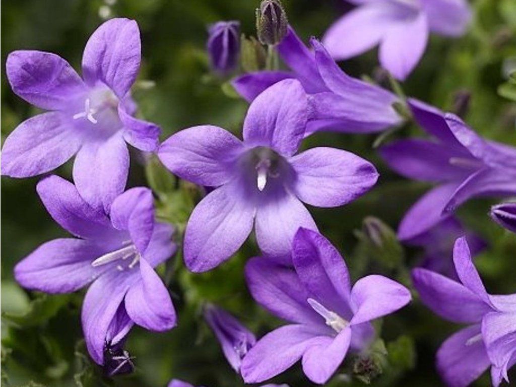 Dalmatinische Glockenblume 'Clockwise' - attraktive Glockenblume mit kompaktem, polsterförmigem Wuchs, die aus felsigen Hängen und Geröllhalden Dalmatiens und angrenzender Gebiete Südosteuropas stammt, wo sie in Spalten und auf flachen Böden wächst. Die Sorte 'Clockwise' gehört zur Serie Clockwise™, die für kompaktes, einheitliches Wachstum und frühe, zuverlässige Blüte gezüchtet wurde, einschließlich F1-Linien für die Vermehrung aus Samen. Sie bildet ein niedriges, dichtes Polster aus kleinen, herzförmigen bis nierenförmigen Blättern, die in milden Wintern oft grün bleiben. An kurzen Stielen öffnen sich von Juni bis August nach und nach zahlreiche tiefblaue bis blauviolette, glockenförmige Blüten, die knapp über dem Laub sitzen und wie ein zarter farbiger Schleier wirken. In ausgewachsenem Zustand erreicht sie etwa 15–20 cm Höhe und 40–60 cm Breite, die niederliegenden Stängel können über den Rand von Gefäßen oder Mauern hängen. In der Komposition harmoniert sie mit Felsensteinkraut, Fetthennen, Thymian und niedrigen Gräsern, unter Sträuchern kann sie den Rand von Pflanzungen abmildern. Die Blüten liefern Nektar und Pollen und werden gerne von Bienen und Hummeln besucht, die Pflanze ist dornenlos und wird in der Gartenpraxis zu den üblicherweise ungiftigen Stauden gezählt. Der Duft der Blüten ist meist unauffällig, daher liegt der Nutzen hauptsächlich im visuellen und bodendeckenden Bereich.