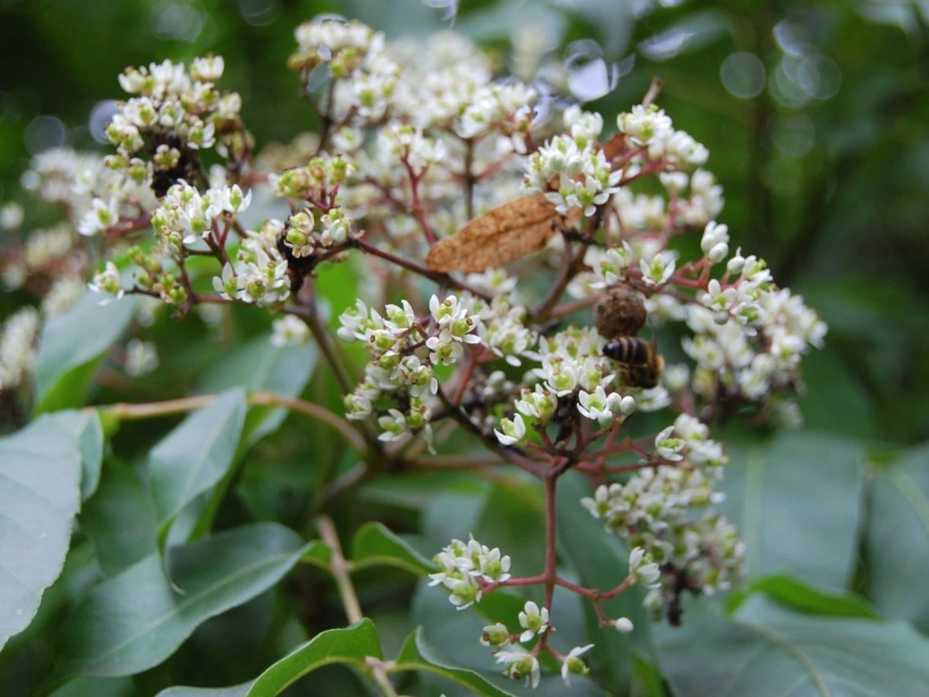 Daniel-Bienenbaum – oder auch Bienenbaum. Ein sehr interessanter und attraktiver, laubabwerfender Baum aus Asien. Er zeichnet sich durch kräftiges Wachstum und eine mächtige, abgerundete, halboffene Krone aus. Die Rinde ist dunkelgrau, glatt und hat Lentizellen. Im Gegensatz dazu sind die Zweige olivgrün und haben kleine weißliche Lentizellen – sie verfärben sich allmählich graubraun. Er erreicht eine Höhe von bis zu 20 m, je nach Wachstumsbedingungen. Die Blätter bestehen aus 5 - 9 gegenständigen Blättchen und sind 20 - 35 cm lang. Jedes Blatt ist eiförmig und verjüngt sich zu einer Spitze, 4 - 9 cm lang mit kurzem Stiel. Die Oberseite des Blattes ist dunkelgrün, während die Unterseite hellgrün ist. Seine Beliebtheit verdankt er seinem dekorativen Wert, aber auch seiner sehr späten Blütezeit, die gerade von Imkern geschätzt wird. Er blüht Ende Juli bis August mit kleinen, weißen Blüten, die in flachen Rispen angeordnet sind. Nach den Blüten erscheinen am Baum viele rötliche Kapseln, die nach dem Öffnen schwarze und glänzende Samen freilegen, die von Vögeln häufig gesucht werden. Beim Zerreiben einiger Teile des Baumes wird Sie ein angenehmer Kräuterduft umgeben. Ein nützlicher Baum, der vor allem wegen seiner dekorativen Eigenschaften gepflanzt wird, aber auch wegen seiner Fähigkeit, Bestäuber aller Art in einer Zeit anzulocken, in der alles bereits verblüht ist.