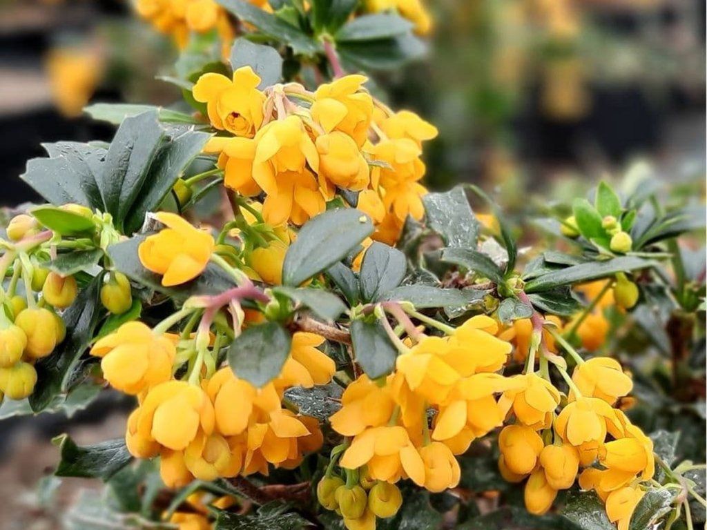 Berberitze Darwinii 'Compacta' - Zwerg-Kultivar der Berberitze, eines immergrünen Strauchs, der ursprünglich aus Süd-Chile und Patagonien stammt, wo er an Waldrändern und auf felsigen Hängen wächst. Die kompakte Form entstand durch die Auswahl von Pflanzen mit dichterer Verzweigung und langsamerem Wachstum. Er erreicht eine Höhe von etwa 80-120 cm und eine ähnliche Breite, bildet eine halbkugelförmige Wuchsform und die Triebe tragen kurze Dornen. Die Blätter sind klein, ledrig, glänzend dunkelgrün und bilden das ganze Jahr über eine markante Masse. Im April und Mai erscheinen gelb-orangefarbene, kleine Blüten in dichten Trauben, die bestäubende Insekten anlocken. Im Herbst reifen ovale, blau-schwarze Beeren mit bereifter Oberfläche, die traditionell zur Herstellung von Marmeladen oder zum Trocknen verwendet werden. Sie enthalten Vitamin C, Anthocyane und andere Schutzstoffe. In der Gartengestaltung wird sie in niedrigen, frei wachsenden oder geformten Hecken, im Steingarten, an trockenen Hängen und als immergrüner Kontrast zu Stauden und Gräsern eingesetzt.