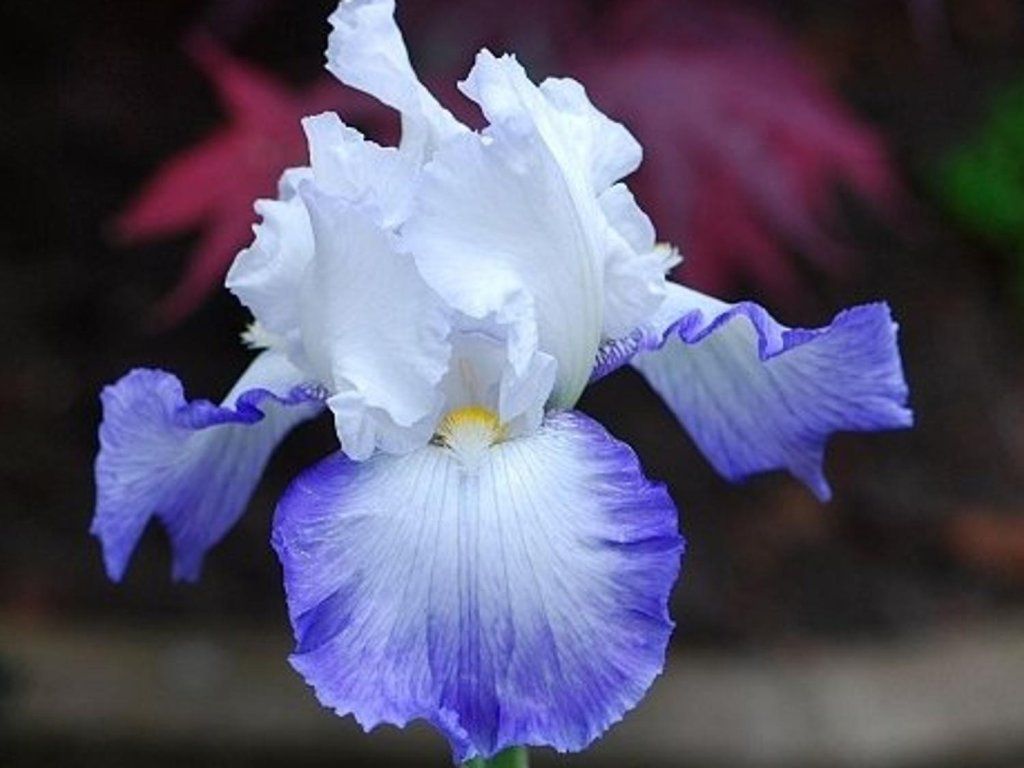 Iris germanica 'Alizes' - eine Rhizompflanze aus der Gruppe der Gartenhybriden, die auf europäischen Arten der Gattung Iris basieren und natürlich auf sonnigen, steinigen und gut durchlässigen Hängen wachsen. Die Sorte wurde 1987 von Jean Cayeux in Frankreich gezüchtet und in das Sortiment aufgenommen. An kräftigen Stielen von etwa 84 cm Höhe blühen im Mai und Juni große Blüten mit der typischen „bärtigen“ Struktur. Die aufrechten Blütenblätter sind reinweiß, die hängenden Blütenblätter sind blau mit weißer Mitte und in der Mitte ragt ein gelber Bart hervor, der als Leiteinrichtung für Bestäuber dient. Die Blüten sind leicht duftend und ziehen Bienen und Hummeln an. Schwertförmige, graugrüne Blätter bilden kompakte Fächer, die Horste erreichen im ausgewachsenen Zustand eine Breite von etwa 35–40 cm. Nach der Blüte bleibt die Pflanze als vertikale Struktur zwischen den Stauden dekorativ. In der Komposition lässt sich 'Alizés' gut mit Lavendel, Salbei, Fetthenne, Beifuß und niedrigeren Ziergräsern kombinieren, wo der kühle blau-weiße Ton zur Geltung kommt. Die Stiele eignen sich auch für die Vase, die Blüten öffnen sich nacheinander.