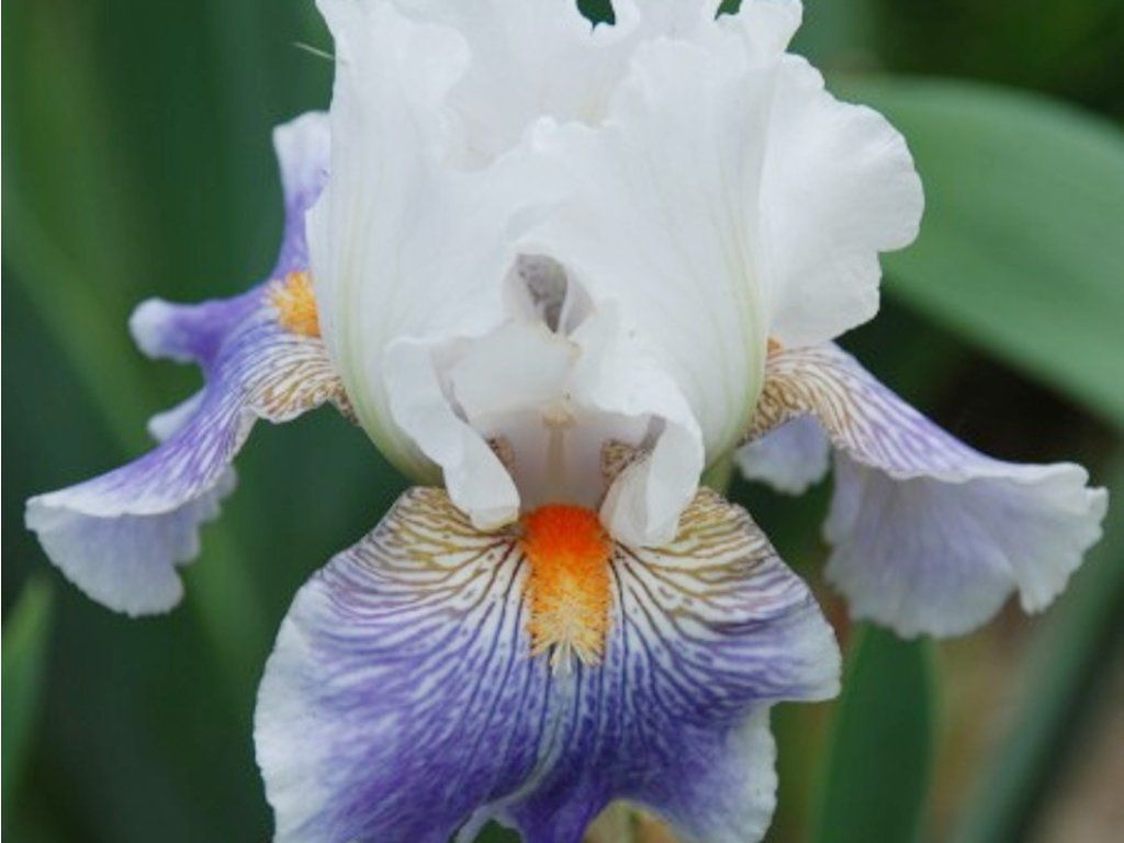 Iris germanica 'American Patriot' - eine großblütige Sorte mit wunderschönen zweifarbigen Blüten. Die oberen Blütenblätter sind reinweiß, während die unteren ausgeprägt purpurblau mit feiner Aderung und einem kontrastierenden weißen Rand sind. Die Blüten sind groß, reichlich gewellt und duften zart. Die Pflanze erreicht eine Höhe von etwa 80 cm und blüht im Frühjahr und Sommer, also von Mai bis Juni. Dank ihres auffälligen Aussehens und der langen Haltbarkeit der Blüten ist sie eine ausgezeichnete Wahl für Beete, Wegränder und zum Schnitt für die Vase.