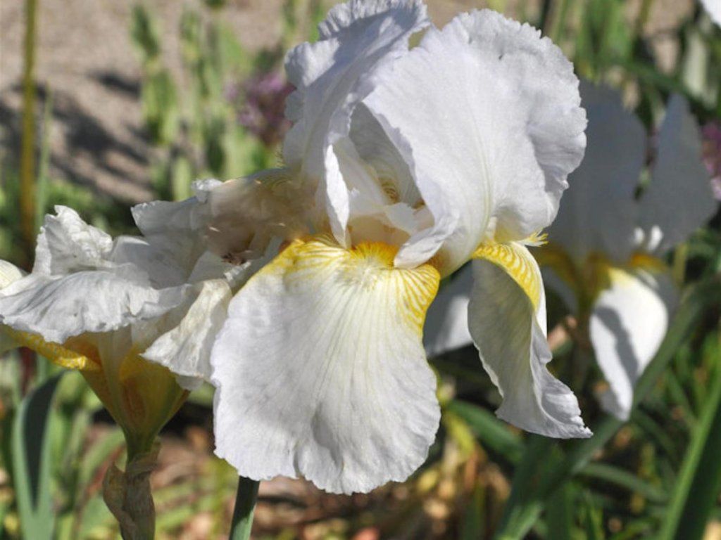 Deutsche Schwertlilie 'Arctic Sunrise' - Es handelt sich um eine höhere, grasblättrige Irisart, die in Sibirien und Alaska heimisch ist.Es handelt sich um eine höhere, grasblättrige Irisart, die in Sibirien und Alaska heimisch ist. Sie bildet einen niedrigen Horst aus hellgrünen, schwertförmigen Blättern. Von April bis Juni erscheinen zahlreiche weißliche Blüten mit gelber Färbung um die Mitte herum. Sie verströmt einen zarten und süßen Duft, der Bienen und andere honigproduzierende Insekten anlockt. Sie eignet sich auch zum Schneiden. In Gruppenpflanzungen mit anderen Sorten kommt sie besonders gut zur Geltung.