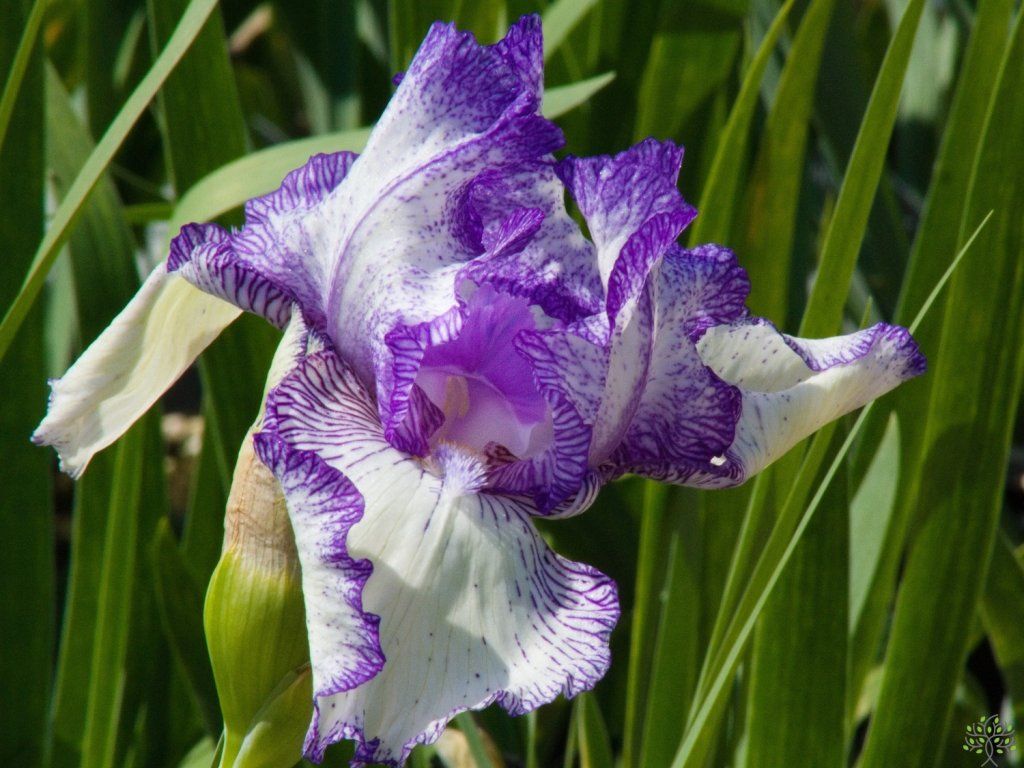 Iris germanica 'Autumn Circus' - gehört zu den hohen Bart-Iris mit remontierender Blüte. Die Sorte wurde von Ben Hager gezüchtet und erstmals 1990 vorgestellt. Die Pflanze bildet ein ausdauerndes Rhizom und Fächer aus graugrünen, schwertförmigen Blättern, aus denen Stiele von etwa 80–95 cm Höhe wachsen. In voller Größe breitet sich der Horst auf etwa 35–45 cm aus und wirkt auch außerhalb der Blütezeit gepflegt. Die Blüten haben einen plicaten Charakter, die Basis ist heller und auf den überhängenden Lappen erscheinen blauviolette Streifen und „Nähte“, wodurch jede Blüte etwas anders wirkt. Der Blütendurchmesser liegt bei etwa 10–12 cm und im Detail sticht auch der kontrastierende „Bart“ in einem helleren Ton hervor. Die Stiele sind für den Schnitt ausreichend fest und die Zeichnungen der Blütenblätter kommen in der Vase gut zur Geltung. Im Beet passt er gut zu weißen Sonnenhüten, Salbei, Ziergräsern und zu Pflanzen mit silbrigem Laub, wo die Streifen rein und klar wirken. Ein zarter Duft entfaltet sich hauptsächlich bei Wärme und am Abend, wenn die Blüten wie Aquarelle wirken.