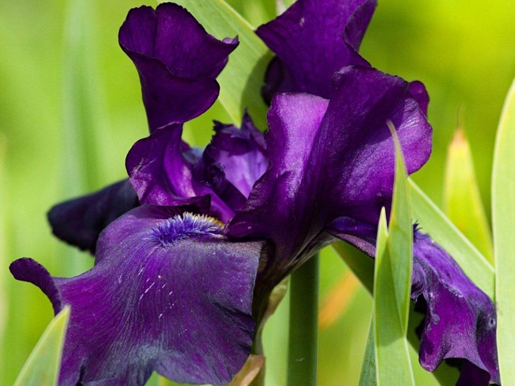 Bart-Schwertlilie 'Black Dragon' - gehört zu den Bart-Schwertlilien, deren Ursprung auf europäische Kreuzungen der Arten Iris pallida und Iris variegata zurückgeht. Die Sorte stammt aus der Züchtung von R. Schreiner aus dem Jahr 1982. Ein ausdauerndes, verzweigtes Rhizom wächst knapp unter der Oberfläche und bildet nach und nach breite Horste. Daraus wachsen Fächer von graugrünen, schwertförmigen Blättern, die nach dem Winter wieder austreiben und im Sommer eine deutliche Vertikale im Beet bilden. Im späten Frühling erheben sich über den Blättern kräftige, verzweigte Blütenstiele von etwa 80–90 cm Höhe. Sie tragen Blüten von etwa 10 cm mit seidig glänzenden, aufrechten Blütenblättern in einem dunkelvioletten Ton und samtigen, fast schwarzvioletten, hängenden Blütenblättern. In der Mitte sticht ein bronzener Bart mit bläulicher Spitze hervor, ein typisches Merkmal der Gruppe. Die Blüten öffnen sich allmählich und bilden im Mai bis Juni einen deutlichen Akzent in Staudenbeeten und zum Schnitt, oft 4–6 Blüten pro Blütenstiel. Die dunkle Farbe kontrastiert gut mit weißen Pfingstrosen, Katzenminze, Salbei oder rosa blühenden Storchschnäbeln, auch die Kombination mit silbrigen Beifußblättern ist eindrucksvoll. Die Pflanze ist für Bienen und Hummeln attraktiv, Rhizome und Blätter sind beim Verzehr reizend und nicht für Kinder oder Haustiere geeignet.