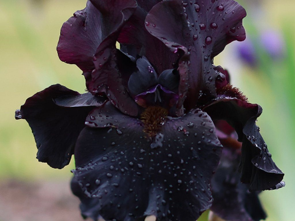Deutsche Iris 'Black Knight' - eine legendäre, historische Sorte der hohen Iris, die auch nach Jahrzehnten noch wegen ihrer dunklen, dramatischen Eleganz begehrt ist. Diese mehrjährige Pflanze erreicht eine Höhe von 80 bis 90 Zentimetern. Es ist absolut frostbeständig und sehr zuverlässig. Der größte ästhetische Vorteil von „Black Knight“ liegt in seiner samtigen Textur und seiner satten Farbe. Die Blüten sind dunkel tintenviolett bis schwarz, wobei die unteren Blütenblätter oft einen noch tieferen, samtigeren Farbton aufweisen als die oberen. Obwohl die moderne Züchtung noch „schwärzere“ Sorten hervorgebracht hat, wird 'Black Knight' nach wie vor für seine Vitalität und seine Fähigkeit geschätzt, im Mai und Juni große Blütenstände zu bilden. Sie benötigt volle Sonne und einen sehr gut durchlässigen, eher trockenen, neutralen bis leicht alkalischen Boden. In Gärten bildet sie einen fantastischen Kontrast zu weißen, hellgelben oder silbrig blühenden Stauden. Am besten kommt sie in sonnigen Blumenbeeten zur Geltung, wo das Licht durch ihre dunklen Blütenblätter scheint.