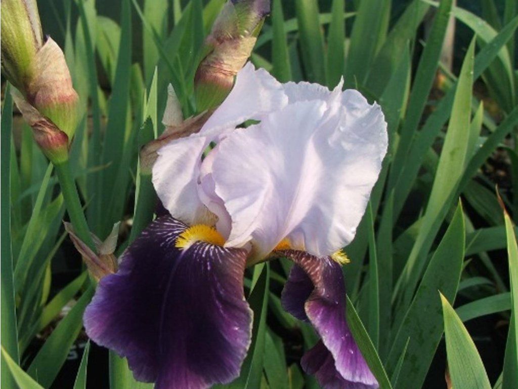 Deutsche Schwertlilie 'Braithwaite' - dies ist eine höhere beliebte Sorte der Schwertlilie, die bis zu 100 cm hoch wird. Hohe, feste Stiele produzieren auffällige und angenehm duftende Blüten mit dunkelvioletten unteren Blütenblättern, gelben behaarten Bärten und reinweißen oberen Blütenblättern. Sie blühen von April bis Mai. Sie bildet Büschel von schwertförmigen, flachen Blättern, die graugrün mit einem Hauch von Blaugrün sind. Eignet sich hervorragend für gemischte Staudenbeete, aber auch für Gruppenpflanzungen mit anderen Kultivaren. Die Blüten eignen sich gut als Schnittblumen.