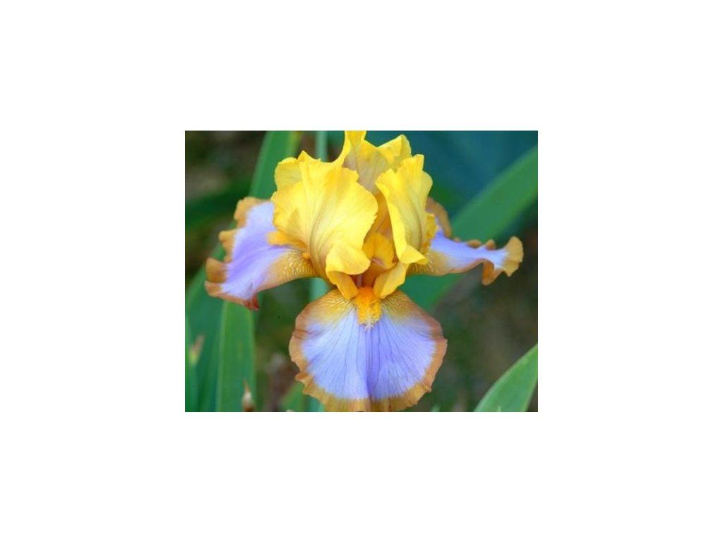 Schwertlilie 'Brown Lasso' - sehr dekorativer Kultivar mit einer auffälligen gelben Blüte, die von violett-blauen Blütenblättern mit orangebraunem Rand begleitet wird. Er erreicht eine Höhe von 80 cm und eine Breite von 30 cm. Blüht von Mai bis Juni.