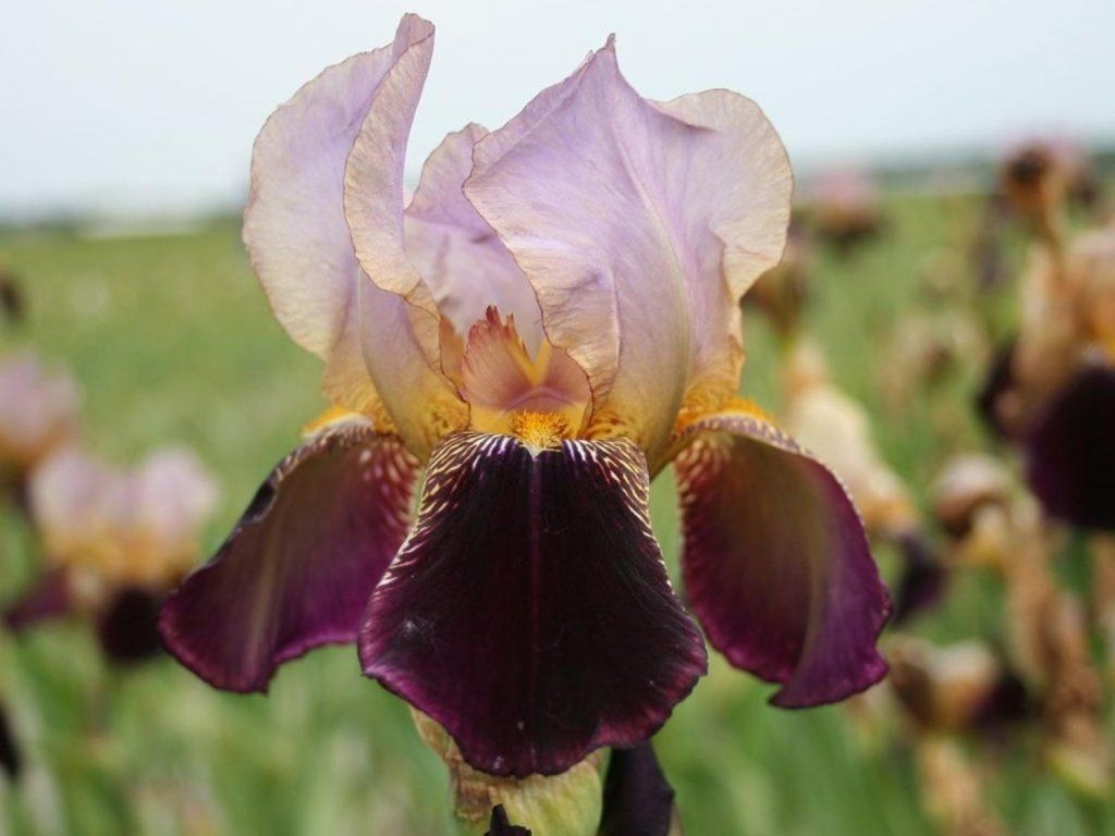 Iris germanica 'Bruno' - eine attraktive Sorte, die bis zu 80 cm hoch wird. Seine festen Stiele produzieren auffällige und angenehm duftende Blüten mit dunkelweinroten unteren Blütenblättern, gelben behaarten Staubgefäßen und perlmuttrosa oberen Blütenblättern. Sie blühen von April bis Mai. Sie bildet Büschel von schwertförmigen, flachen Blättern, die graugrün mit einem Hauch von Blaugrün sind. Eignet sich hervorragend für gemischte Staudenbeete, aber auch für Gruppenpflanzungen mit anderen Kultivaren. Die Blüten eignen sich gut als Schnittblumen.