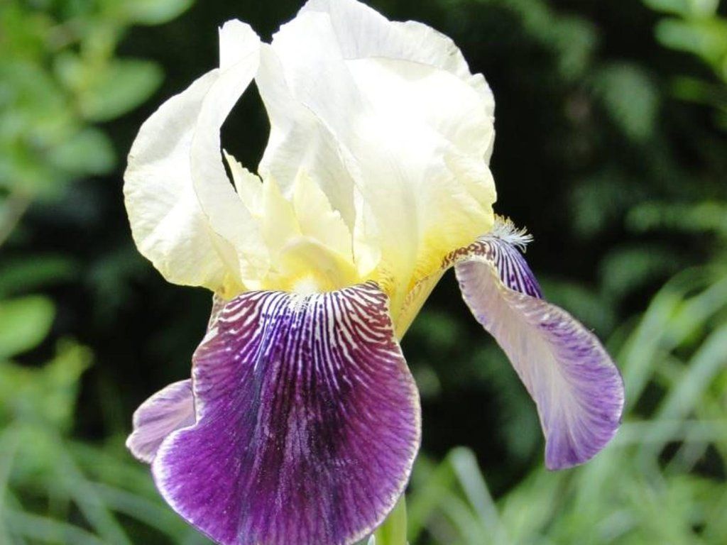 Iris germanica 'Salonique' - eine höhere Sorte der weniger bekannten Iris, die eine Höhe von 80 bis 100 cm erreicht. Aufrechte, kräftige Stiele produzieren eine beträchtliche Menge an auffälligen und angenehm duftenden Blüten, die eine auffällige Kombination aus Weiß mit Pastellgelb und tiefem Violett aufweisen. Blüht ab Mai. Sie bildet Büschel von schwertförmigen, flachen Blättern, die graugrün mit einem Hauch von Blaugrün sind. Eignet sich hervorragend für gemischte Staudenbeete, aber auch für Gruppenpflanzungen mit anderen Kultivaren. Die Blüten eignen sich gut als Schnittblumen.