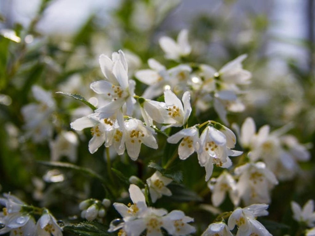 Deutzia Yuki Snowflake 'NCDX1' PBR - ein kompakter, buschiger und abgerundeter Laubstrauch. Er erreicht eine Höhe von etwa 100 cm, abhängig von den Bedingungen. Die Blätter sind eiförmig, dunkelgrün. Im Herbst verfärbt sich ihr Laub in violett-braune Farbtöne. Ende des Frühlings und Anfang des Sommers erscheinen Rispen mit kleinen, duftenden weißen Blüten. Geeignet für die Kultivierung im Freiland und in Behältern. Im Herbst färbt er sich in schönen gelb-orangen Farben.