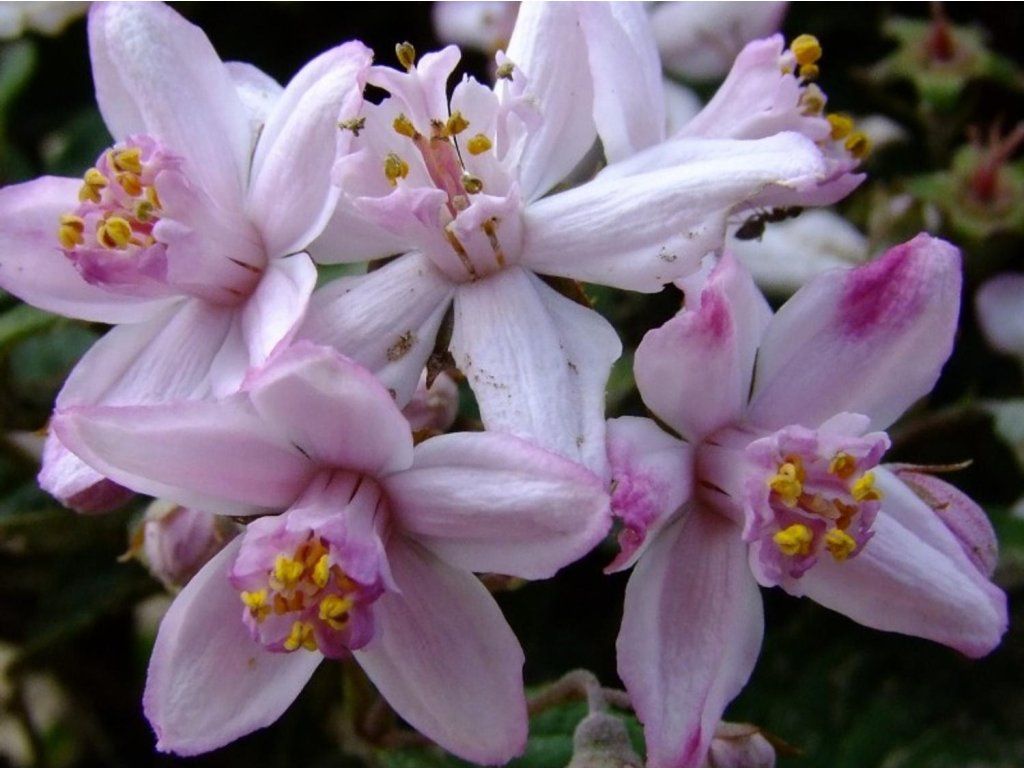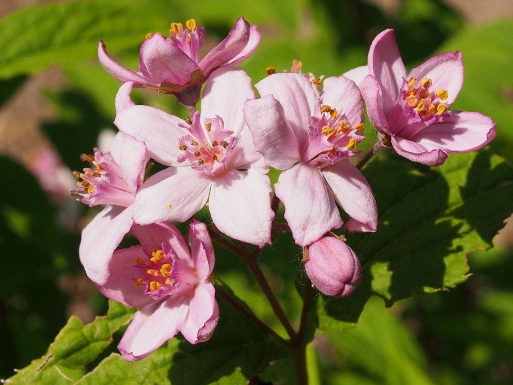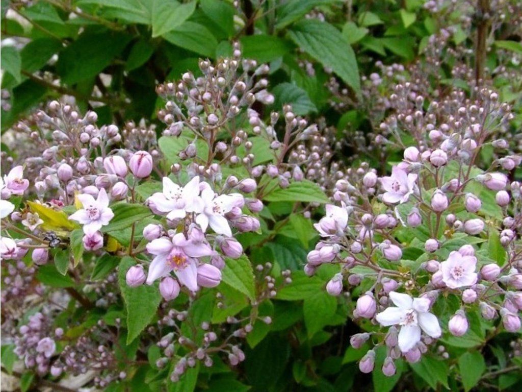 Deutzie 'Contraste' - ein laubabwerfender Strauch mit dichtem Wuchs. Er erreicht eine Höhe von 2 Metern bei einer etwas geringeren Breite. Er zeichnet sich durch schöne sternförmige Blüten aus, die einen zartrosa Farbton haben und am Rand leicht gestreift sein können. Er blüht im Mai und die Blüte ist sehr üppig. Die Blätter sind länglich, lanzettlich mit deutlicher Faltenbildung. Sie sind satt bis dunkelgrün. Geeignet für die Topfkultur.