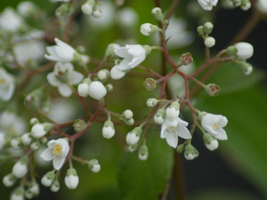 Deutzia 'Magical Silver Star' - Ein relativ neuer, laubabwerfender Kultivar mit zarten, sternförmigen Blüten in Weiß, die im Mai und Juni erscheinen. Die Blätter sind frisch, grün gefärbt. Sie erreicht eine Höhe von 80-100 cm.