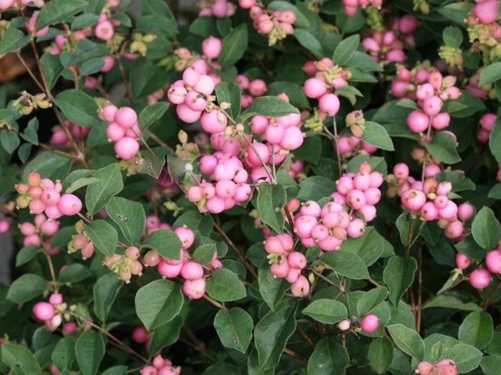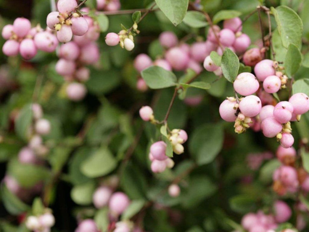 Schneebeere Doorenbos' 'Perlmutt' - Zierstraucherreicht eine Höhe von bis zu 2 m. Ihre dichten, herabhängenden Triebe sind beim Austreiben gelblich. Die Blätter sind elliptisch, breit eiförmig und tiefgrün. Sie bleiben lange am Strauch, außer bei starkem Frost, sogar bis Ende November. Winzige, weiß-rosa Blüten, in Büscheln an den Enden der einjährigen Triebe gesammelt, erscheinen in der zweiten Junihälfte. Es folgen ovale Beeren, die weiß sind und auf der Sonnenseite einen rosa Schimmer aufweisen. Der Strauch trägt sehr viele Früchte, aber Vorsicht, die Früchte sind giftig. Zur Verjüngung der Sträucher empfiehlt es sich, die Pflanzen alle paar Jahre stark zurückzuschneiden.