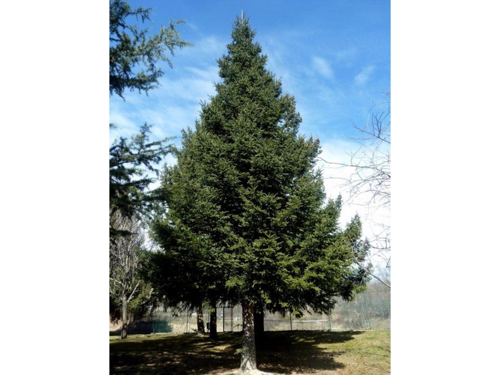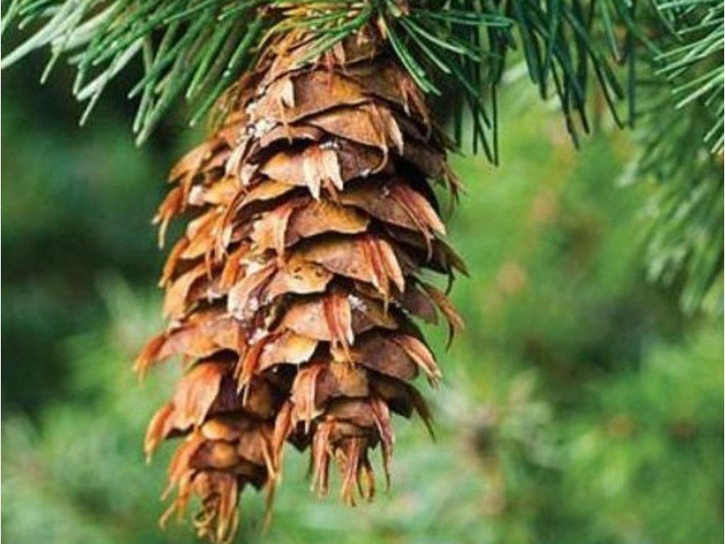 Douglasie - ein schnell wachsender, immergrüner Nadelbaum, der unter seinen eigenen guten Bedingungen in der Reife bis zu 100 m erreichen kann. In unserer Umgebung erreicht er meist eine Höhe von bis zu 50 m. Die Krone behält eine regelmäßige pyramidenförmige Form. Die oberen Äste wachsen senkrecht, die unteren hängen herab. Die Rinde des Baumes ist korkartig und hat tiefe Furchen. Junge Zweige sind gelblich-grün bis gelblich-grau. Der obere Teil der abstehenden Nadeln ist dunkelgrün und glänzend, unten haben sie 2 weiße Streifen. Rot-braune, bis zu 10 cm lange, hängende Zapfen schmücken den Baum. Diese Nadelbaumart zeichnet sich durch ihr starkes Aroma aus.