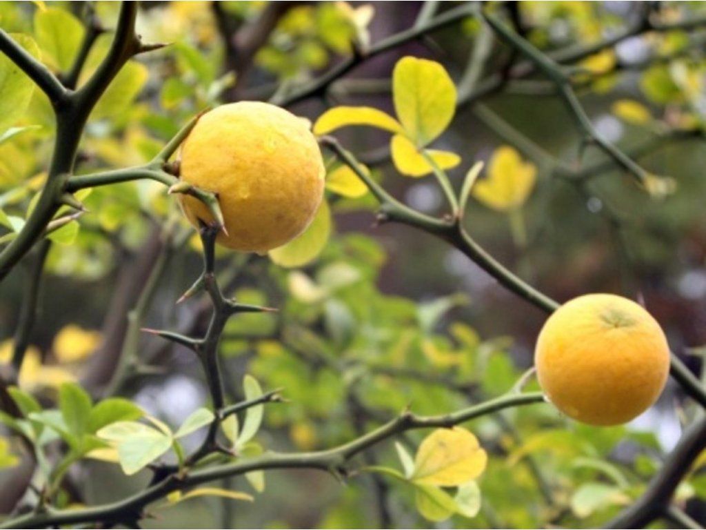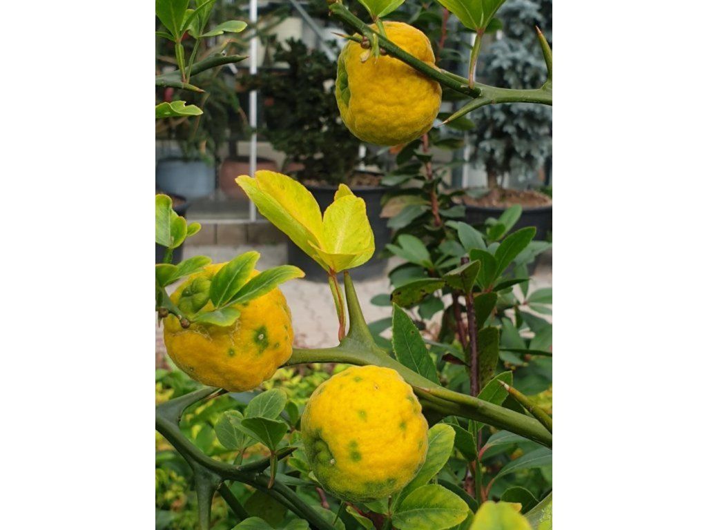 Dreiblättrige Zitrone - ein botanisch interessanter, sommergrüner Strauch bis kleiner Baum aus Ostasien, der sich durch dreilappige, aromatische Blätter und ausgeprägte Dornäste auszeichnet, die Schutz vor Schädlingen bieten und gleichzeitig eine charakteristische Wuchsform gewährleisten. Im ausgewachsenen Zustand erreicht er normalerweise eine Höhe von 3–4 m und eine Breite von 2–3 m, mit moderaten jährlichen Zuwächsen von etwa 20–30 cm. Die Blüten erscheinen im April und Mai, sind weiß, stark duftend und ziehen Bestäuber an. Nach der Blüte bilden sich kugelförmige, orange-gelbe Früchte, 3–4 cm groß, mit einem sehr bitteren und aromatischen Geschmack, die sich zur Herstellung von Marmeladen, Likören oder als Gewürzzutaten eignen. Sie ist voll frostbeständig bis −15 °C. Diese Art wird auch als Unterlage für Zitrusfrüchte geschätzt, da sie die Kälte- und Krankheitsresistenz erhöht. Dank ihres dornigen Wuchses eignet sie sich auch als lebender Zaun zum Schutz vor unerwünschten Eindringlingen, als Solitärelement im Garten oder als interessanter Akzent in Kombination mit Ziersträuchern und Stauden. Die Früchte sind nach Wärmebehandlung essbar, frisch sind sie für den direkten Verzehr zu bitter.