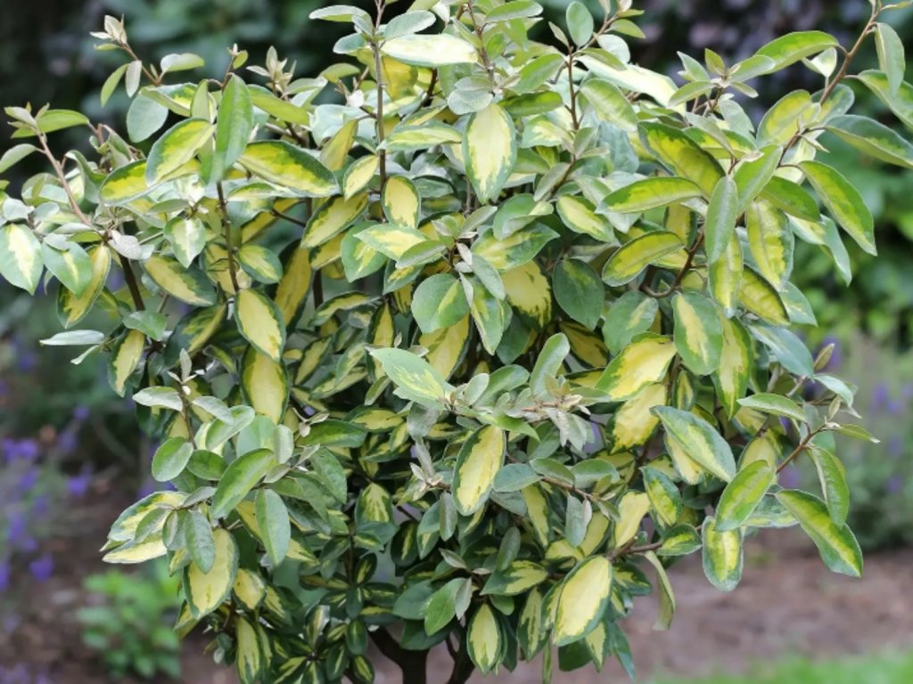 Ebbinge-Ölweide 'Limelight' - eine immergrüne Kreuzung der Arten Elaeagnus macrophylla und Elaeagnus pungens, gezüchtet in Westeuropa in der zweiten Hälfte des 20. Jahrhunderts. Sie gehört zu den bewährten Ziersträuchern, die für ihre Anpassungsfähigkeit und ihr lang anhaltend stabiles Aussehen geschätzt werden. Sie bildet einen aufrechten bis leicht ausgebreiteten, dicht verzweigten Strauch, der im ausgewachsenen Zustand etwa 2,5-3 m hoch und 2-3 m breit wird. Die Blätter sind ledrig, elliptisch, mit einem dunkelgrünen Rand und einer ausgeprägten limettengrünen bis cremefarbenen Mitte, die Unterseite ist fein silbrig. Im Herbst, normalerweise im Oktober und November, erscheinen kleine cremeweiße Blüten mit einem zarten süßen Duft, die für bestäubende Insekten attraktiv sind. Die Früchte sind kleine, silbrige Beeren, die unter unseren Bedingungen eher von ornamentalem Wert sind. Sie findet Anwendung in Hecken, Windschutzstreifen, Stadtbegrünung und als Solitär, wo der Kontrast des panaschierten Laubes mit dunklen Nadelgehölzen oder immergrünen Sträuchern zur Geltung kommt.