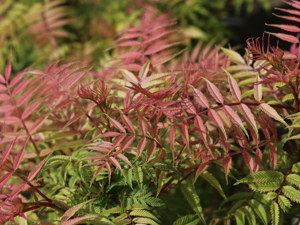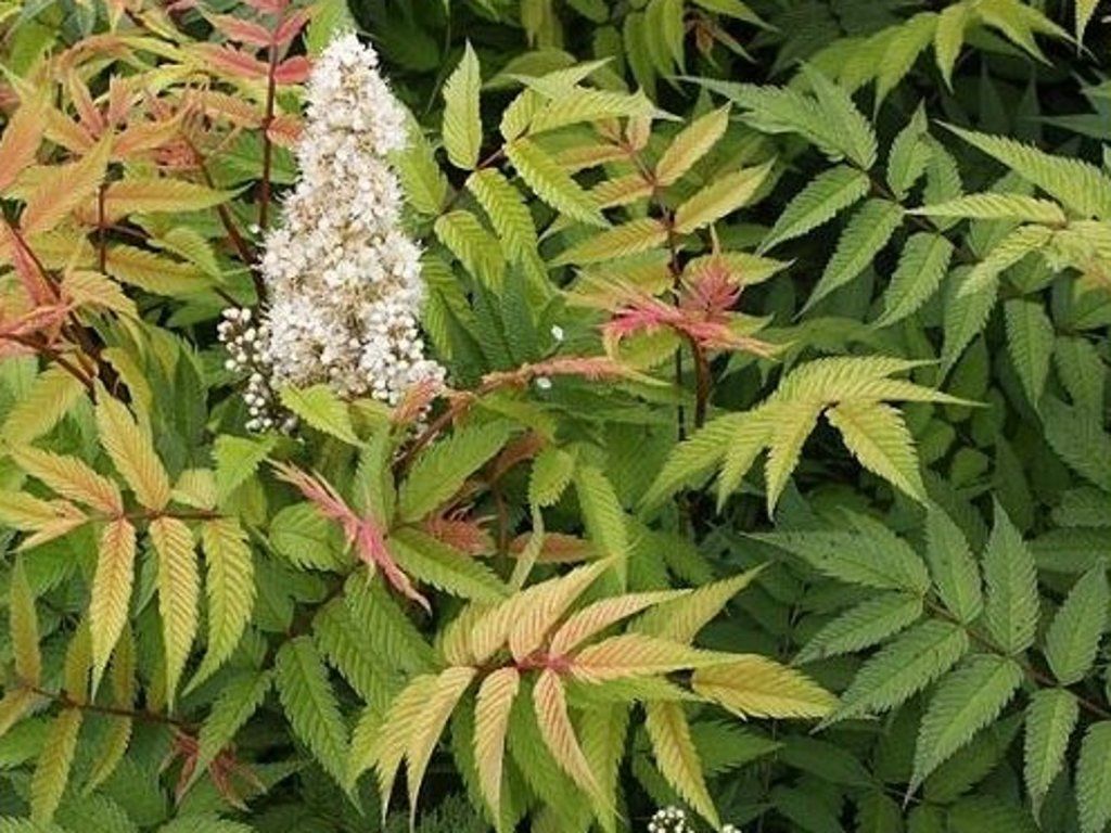 Ebereschenblättrige Fiederspiere ist ein schnell wachsender, laubabwerfender Strauch aus Ostasien, der vor allem für seine großen, gefiederten Blätter, ähnlich denen der Eberesche, und seine üppige Sommerblüte geschätzt wird. Er erreicht normalerweise eine Höhe von 1,5–3 Metern und bildet dichte, ausladende Bestände dank seiner starken Ausbreitungsfähigkeit. Er eignet sich sehr gut für naturnahe Pflanzungen, größere Gärten und als undurchdringliche Hecke.Blüht im Juni bis Juli, wenn sich an den Triebspitzen aufrechte, kegelförmige Rispen aus kleinen cremeweißen Blüten zeigen. Die Blüten sind leicht duftend und sehr attraktiv für Bienen und andere Bestäuber. Nach der Blüte bleiben trockene Rispen zurück, die entfernt werden können, aber nicht unbedingt störend sind. Die Früchte haben keinen nennenswerten Zierwert. Die Blätter treiben im Frühling bronzerot aus, werden allmählich grün und färben sich im Herbst gelb bis orange. Der Strauch ist während der gesamten Vegetationsperiode dekorativ, auch wenn seine Hauptwirkung eher in der Blattmasse als in den Blüten liegt.