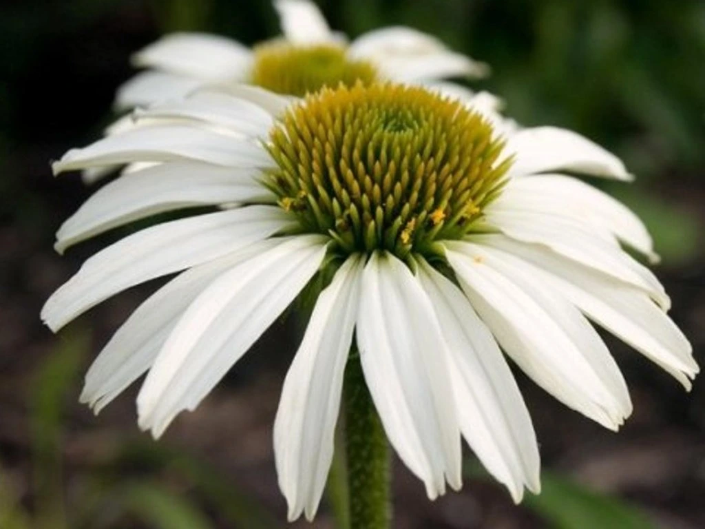 Echinacea 'Avalanche' - eine anspruchslose Staude, die aus dem Mittleren Westen Amerikas und Europas stammt. Wird oft als Heilkraut verwendet. Sie erreicht eine Höhe von etwa 20-40 cm. Die Blüten bestehen aus zarten, schmalen Blütenblättern, die weiß gefärbt sind. Die Mitte der Blüte ist braungelb gefärbt. Die Blätter sind tiefgrün. Für Schmetterlinge und andere Bestäuber sind diese Blüten aufgrund ihres auffälligen Aussehens und des verfügbaren Nektars attraktiv. Die Blütezeit ist von Juli bis September. Ideal für die Pflanzung in Beeten, Steingärten oder in Gefäßen mit anderen Kultivaren und Farbvarianten von Echinaceen. Sie ist nicht anspruchsvoll in der Pflege. Geeignet für den Schnitt.