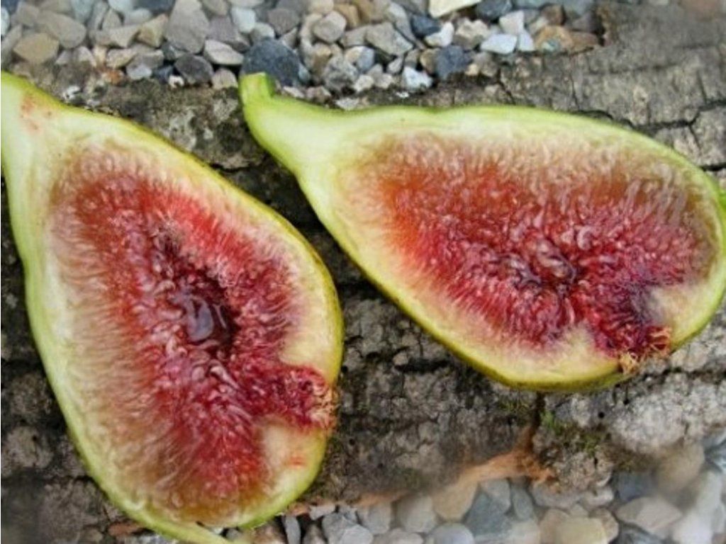 Feigenbaum 'Dalmatien' - eine traditionelle und sehr beliebte Sorte aus Dalmatien an der Adriaküste, wo sie seit Jahrhunderten angebaut wird. Sie gehört zu den zuverlässigsten hellen Feigen, die auch für das mitteleuropäische Klima geeignet sind, da sie guten Geschmack, frühe Reife und relativ gute Widerstandsfähigkeit kombiniert. Sie wächst als mittelstark wachsender, laubabwerfender Strauch oder kleiner Baum von etwa zwei bis vier Metern Höhe, mit einer breiten Krone und großen, tief gelappten Blättern, die der Pflanze ein ausgeprägt mediterranes Aussehen verleihen. Die Früchte sind auffallend groß, oft sehr massig, mit einer grünlich-gelben bis hell gelblich-grünen Schale. Das Fruchtfleisch ist himbeerrot, sehr süß, saftig, zart und aromatisch, mit einem ausgeprägten Honigton. Aufgrund ihrer Größe und ihres attraktiven Fruchtfleisches gehört sie zu den besten Dessertfeigen. Sie reifen normalerweise vom Spätsommer bis September und bei guten Sommern bis in den Oktober hinein. Die Ernte ist auch in weniger warmen Gebieten relativ sicher, da die Sorte zu den früheren hellen Typen gehört. In der Küche sind sie hervorragend zum direkten Verzehr geeignet, passen aber auch sehr gut zu Salaten, Desserts, Kuchen, Marmeladen, Mus und zum Trocknen. Sie enthält eine hohe Menge an Ballaststoffen, natürlichen Zuckern, Mineralien und Antioxidantien, so dass sie wie andere Feigensorten zu einer gesunden Verdauung und Energieergänzung beitragen kann. Sie fruchten ohne Bestäubung und benötigen keine Feigenwespe. Sie ist im Allgemeinen pflegeleicht im Anbau und hat eine gute Krankheitsresistenz, solange sie keiner ständig nassen Erde ausgesetzt ist.