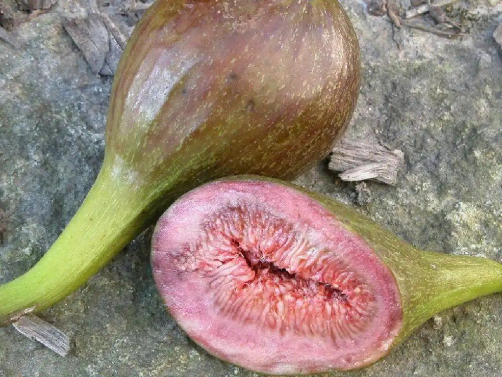 Feigenbaum 'Madeleine des 2 Saisons' - eine traditionelle französische Sorte, die für ihre Fähigkeit bekannt ist, zweimal im Jahr Früchte zu tragen, was sich auch in ihrem Namen „Madeleine zweier Jahreszeiten“ widerspiegelt. Sie stammt aus Frankreich, wo sie für ihre zuverlässigen frühen Erträge und den angenehmen Geschmack der Früchte beliebt war. Er wächst als mittelstark wachsender, laubabwerfender Strauch oder kleiner Baum, der normalerweise zwei bis drei Meter hoch wird, mit einem eher kompakten Wuchs und großen, gelappten Blättern. Dank ihres guten Wachstums und ihrer Bereitschaft zu verzweigen, eignet sie sich auch für kleinere Gärten oder die Kübelkultur. Die Früchte sind mittelgroß, kugelförmig bis leicht birnenförmig, mit einer hellgrünen bis gelbgrünen Schale, die bei voller Reife einen zarten goldenen Ton annehmen kann. Das Fruchtfleisch ist rosa, zart, süß und saftig, mit einem ausgewogenen, leicht honigartigen Geschmack und einem angenehmen Aroma. Die Sorte wird vor allem dafür geschätzt, dass ihre Früchte sehr früh reifen – die erste Ernte erfolgt bereits ab Juli am letztjährigen Holz. Die zweite, Haupternte folgt im Spätsommer und Frühherbst, wodurch eine lange Erntezeit gewährleistet ist. In der Küche eignet sich diese Sorte vor allem zum Frischverzehr, macht sich aber auch gut in Salaten, Desserts, Kuchen oder in Kombination mit Käse. Sie kann auch für Marmeladen oder zum Trocknen verwendet werden. Die Früchte enthalten Ballaststoffe, natürliche Zucker, Antioxidantien und Mineralstoffe und stellen somit einen wertvollen Bestandteil einer abwechslungsreichen Ernährung dar. Er trägt ohne Bestäubung Früchte. Die Frostbeständigkeit ist mäßig – in wärmeren Gebieten Mitteleuropas überwintert sie oft problemlos, in kälteren Lagen wird ein Winterschutz geschätzt. Sie leidet in der Regel nicht unter Krankheiten, solange sie genügend Sonne und trockene Wurzeln hat.