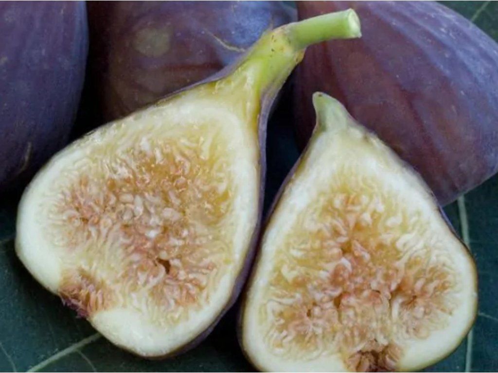 Feigenbaum 'Osborn's Prolific' - eine ältere, gut etablierte Sorte aus den USA, wo sie als zuverlässige und sehr ertragreiche Sorte gezüchtet wurde, die auch für Regionen mit kürzeren Sommern geeignet ist. Sie wird für ihre reiche Ernte, ihren angenehmen Geschmack und ihr widerstandsfähigeres Wachstum geschätzt. Er wächst als mittelstark wachsender, laubabwerfender Strauch oder kleiner Baum, der normalerweise zweieinhalb bis dreieinhalb Meter hoch wird, mit einer gut verzweigten Krone und großen, tief geteilten Blättern. Er lässt sich gut formen, wächst nach dem Schnitt schnell nach und gehört zu den Sorten, die auch bei weniger idealem Wetter einen stabilen Ertrag bringen. Die Früchte sind mittelgroß bis groß, birnenförmig, mit einer attraktiven dunkelrotbraunen bis violetten Schale. Das Fruchtfleisch ist rot, süß, weich und aromatisch, mit einem reichen, honigartigen, fruchtigen Geschmack. Der Geschmack ist sehr angenehm und gut ausbalanciert, was die Sorte zu einem guten Desserttyp macht. Die Früchte reifen vom späten August bis September, oft in zwei aufeinanderfolgenden Wellen. Die Sorte ist auch dafür bekannt, dass die Früchte gut am Zweig halten und weniger platzen, was Züchter in regenreicheren Gebieten zu schätzen wissen. In der Küche eignet sie sich besonders zum direkten Verzehr, da ihr süßes und aromatisches Fruchtfleisch frisch am besten zur Geltung kommt. Sie ist auch hervorragend in Obstsalaten, Kuchen, Joghurts, Desserts oder in Kombination mit Käse. Man kann auch Marmeladen daraus zubereiten oder sie trocknen. Die Früchte sind reich an Ballaststoffen, natürlichen Zuckern, Kalium, Kalzium und Antioxidantien, was sie zu einem nahrhaften Bestandteil einer abwechslungsreichen Ernährung macht. Sie trägt zuverlässig ohne Bestäubung Früchte. Die Frostbeständigkeit ist mäßig – in wärmeren Teilen Mitteleuropas überwintert sie in der Regel gut, in kälteren Regionen ist eine Überwinterung ratsam. Sie leidet normalerweise nicht unter Krankheiten, solange sie genügend Licht hat und nicht dauerhaft in feuchtem Boden steht.
