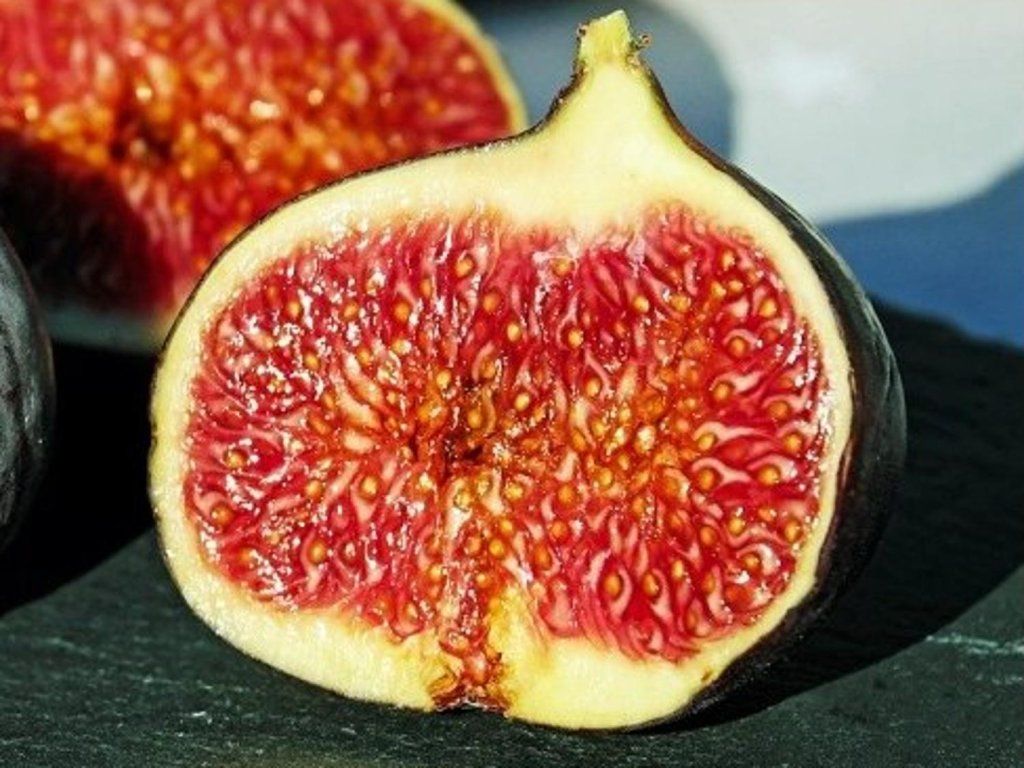 Feigenbaum 'Rouge de Bordeaux' – eine sehr alte und hochgeschätzte französische Sorte aus der Region Bordeaux, wo sie seit Generationen wegen ihrer außergewöhnlich schmackhaften dunklen Früchte angebaut wurde. Sie gehört zu den hochwertigen Dessertfeigen mit reichem Aroma und regelmäßiger Fruchtbildung. Sie wächst als mittelstark wachsender, laubabwerfender Strauch oder kleiner Baum, der normalerweise zwei bis drei Meter hoch wird, mit einem gut verzweigten, eher kompakten Habitus und großen, gelappten Blättern. Dank seines festen, gut ausgereiften Holzes ist die Pflanze relativ widerstandsfähig und wächst auch in wärmeren Regionen Mitteleuropas zuverlässig. Die Früchte sind mittelgroß bis groß, von regelmäßiger birnenförmiger oder leicht kugelförmiger Gestalt, mit einer tiefvioletten bis fast schwarzen Schale, die bei voller Reife eine matte dunkle Oberfläche annimmt. Das Fruchtfleisch ist tiefrot, sehr süß, saftig und aromatisch, mit einem vollen, reichen Dessertgeschmack. Gehört zu den Sorten mit ausgeprägt süßem, honigartigem Fruchtcharakter und dichterer Fruchtfleischkonsistenz. Reift meist von Ende August bis September, unter geeigneten Bedingungen bis in den Oktober hinein. In der Küche ist sie vor allem frisch hervorragend, da ihr reiches Aroma am besten sofort nach der Ernte zur Geltung kommt. Eignet sich auch hervorragend für Salate, Desserts, Kuchen, zu Käse, in Joghurt oder für luxuriöse Marmeladen. Ihr rotes Fruchtfleisch ergibt bei der Verarbeitung eine sehr attraktive Farbe. Die Früchte enthalten Ballaststoffe, natürliche Zucker, Mineralstoffe und Antioxidantien und sind somit eine nahrhafte Ergänzung einer abwechslungsreichen Ernährung. Sie trägt ohne Bestäubung durch die Feigenwespe. Die Frostbeständigkeit ist mittel – an geschützten Standorten Mitteleuropas überwintert sie oft gut, in kälteren Regionen ist ein Winterschutz ratsam. Sie leidet nicht an Krankheiten, solange sie nicht in schwerem, dauerhaft staunassen Boden angebaut wird.