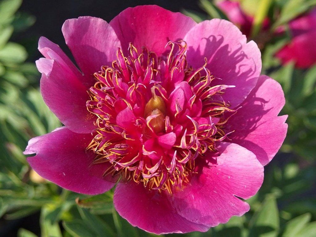 Pfingstrose 'Anemoniflora' - eine Zwergsorte der Pfingstrose, die je nach Kulturbedingungen nur 30 - 40 cm hoch wird. Im Mai und Juni blüht sie mit leuchtend rosa-roten Blüten, deren Mitte mit auffälligen Staubgefäßen verziert ist. Bereits junge Pflanzen zeichnen sich durch eine reiche Blüte aus. Sie duftet zart und süß. Starke Stiele mit Knospen sind aufrecht und tragen typisch geteilte, dunkelgrüne Blätter. Diese nehmen im Herbst Rot-, Orange- und Gelbfarbtöne an. Sie ist ideal für die Pflanzung in jedem Garten. Wenn wir verschiedene Sorten von Pfingstrosen je nach Blütezeit pflanzen, können wir uns mehrere Wochen lang an ihren Blüten erfreuen. Die Blüten eignen sich gut als Schnittblumen.