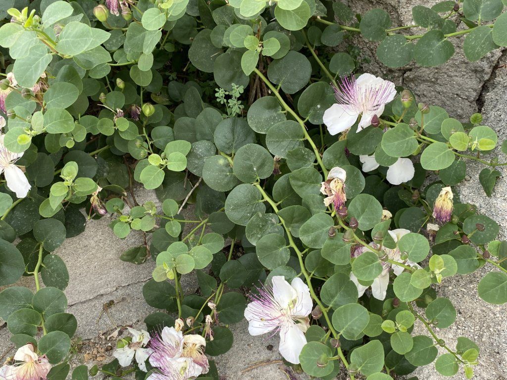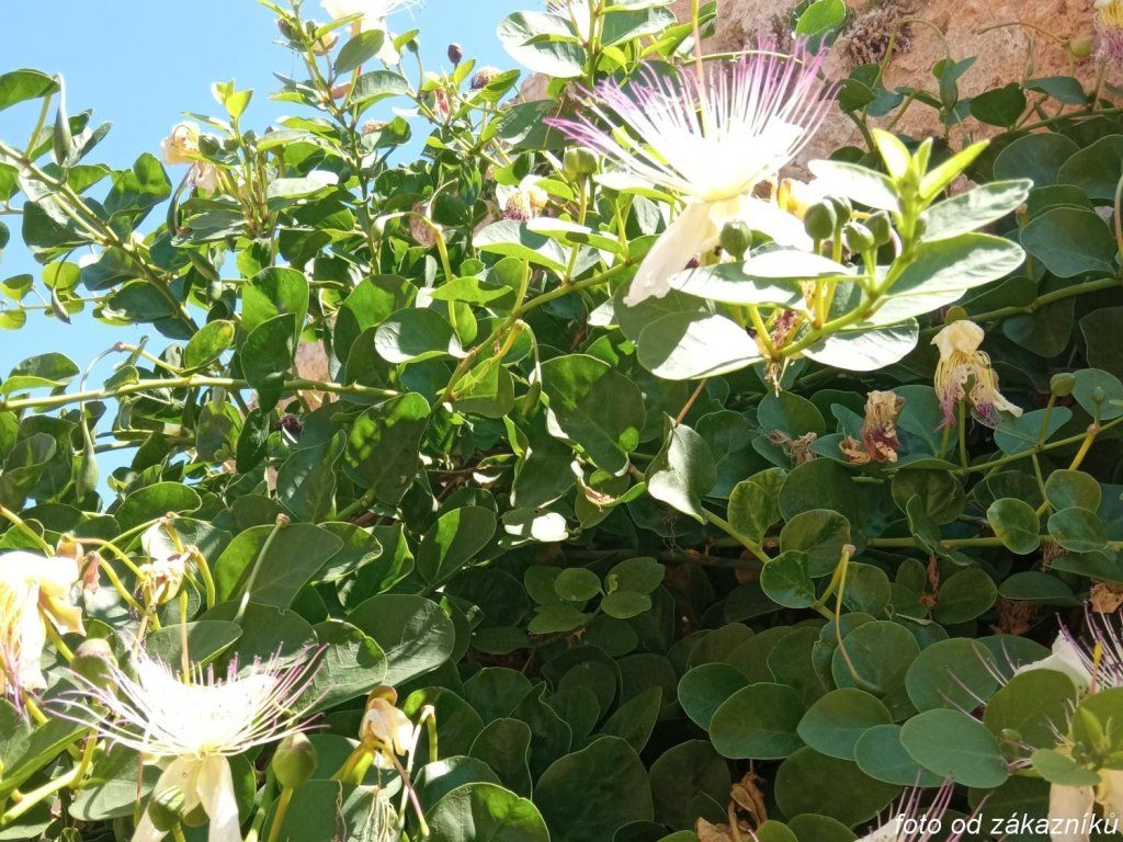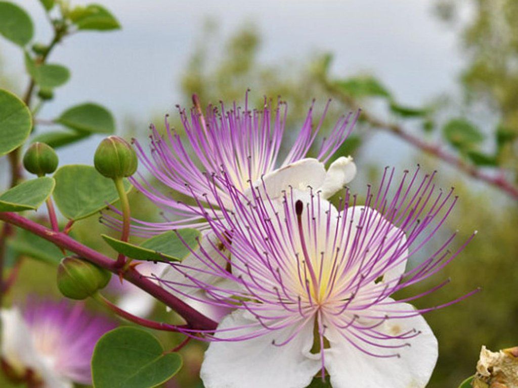Kapernstrauch - ein ausdauernder mediterraner Strauch aus der Familie der Kaperngewächse, der natürlich an trockenen Felshängen, in Mauerritzen und auf Kalkschutt wächst. In warmen Regionen bildet er einen niedrigen, ausladenden Habitus, unter unseren Bedingungen bewährt er sich am besten als Kübelpflanze in einem größeren Topf. Die Triebe sind oft niederliegend bis überhängend, häufig mit kleinen hakenförmigen Dornen. Die ledrigen, rundlich-ovalen Blätter sind graugrün und leicht fleischig. Von Mai bis September öffnen sich in den Blattachseln einzelne Blüten mit einem Durchmesser von etwa 5–7 cm, mit vier weißen Blütenblättern und auffallend langen, violett gefärbten Staubgefäßen, zart duftend. Ungeöffnete Knospen stellen Kapern dar, nach dem Salzen oder Einlegen in eine Lake erhalten sie ihren typischen salzig-sauren, pikant-bitteren Geschmack. Die verbleibenden Blüten setzen längliche, olivgrüne Früchte an, sogenannte Kapernbeeren, die ähnlich wie Oliven eingelegt werden. Knospen und Früchte enthalten natürlicherweise Vitamin C, Flavonoide einschließlich Rutin und Mineralstoffe, die vor allem für ihre antioxidativen Eigenschaften in der Ernährung geschätzt werden. Die Blüten sind zwittrig und die Pflanze ist meist selbstbestäubend, dennoch wird sie im Sommer von Bienen und anderen Bestäubern aufgesucht.