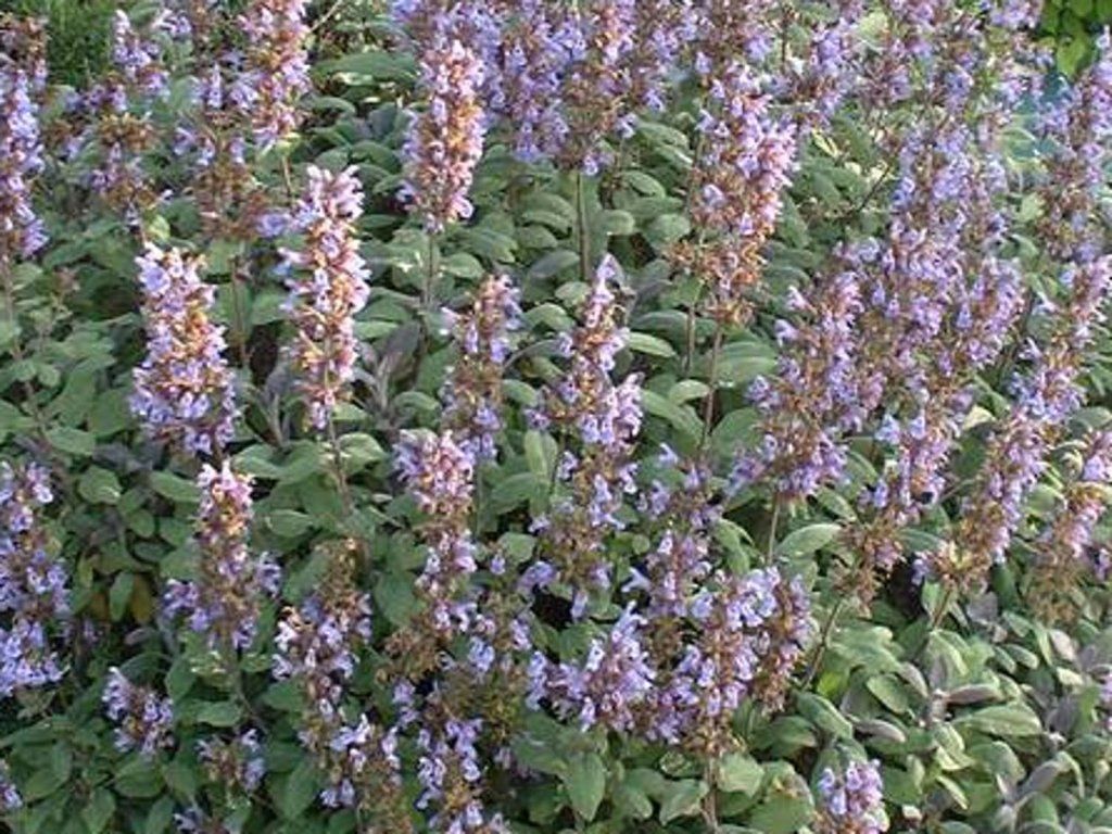 Salbei 'Purpurea' - ein immergrüner bis halbimmergrüner Kultivar des echten Salbeis, der sowohl nützliche als auch dekorative Werte vereint. Im ausgewachsenen Zustand erreicht er eine Höhe von ca. 40–60 cm und eine Breite von 50–70 cm und bildet einen kompakten, dicht verzweigten Halbstrauch mit teilweise verholzendem Fuß. Junge Blätter haben eine tief purpurne bis weinrote Färbung, die sich im Laufe der Saison zu grün-violetten Farbtönen mit silbrigem Schimmer verändert. Die Blätter sind länglich, fein behaart und stark aromatisch, mit einem typisch würzigen Duft und einem leicht bitteren Geschmack, der in der Küche bei der Zubereitung von Fleisch, Nudeln und Kräutermischungen verwendet wird. Von Mai bis Juni wachsen über dem Laub aufrechte Ähren von blauvioletten Blüten, die Bienen und andere Bestäuber anlocken. Die Sorte eignet sich für Kräuter- und Schotterbeete, in gemischten Staudenkompositionen sowie in Kübeln auf Terrassen. Sie kontrastiert gut mit silbrigblättrigen Arten, Lavendel oder Ziergräsern. Sie benötigt volle Sonne und einen leichten, gut durchlässigen Boden mit einem pH-Wert von etwa 6,5–7,5. Sie verträgt keine längerfristige Staunässe, kommt aber gut mit trockeneren Bedingungen zurecht. Die Frostbeständigkeit liegt bei etwa −18 bis −20 °C, in kälteren Regionen wird eine Winterabdeckung der Wurzelzone empfohlen. Regelmäßiger Frühlingsschnitt fördert kompaktes Wachstum und die Erneuerung der Blattfärbung.