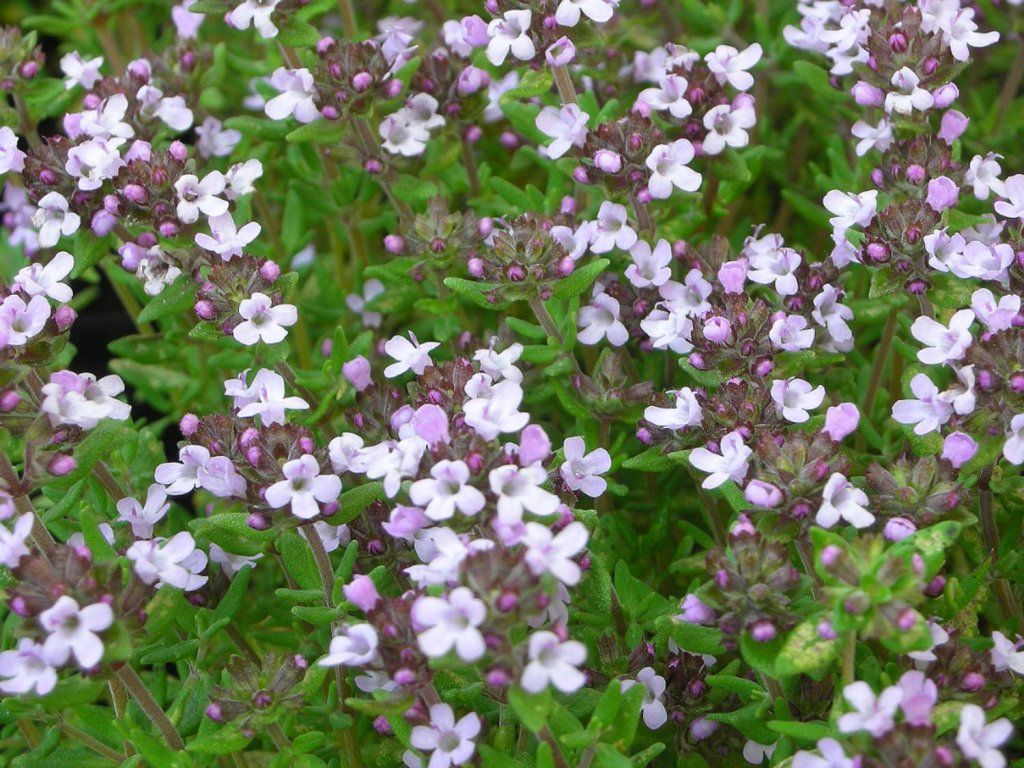 Echter Thymian 'Compactus' - halbholziger Strauch mit niedriger, kompakter Wuchsform, erreicht eine Höhe von 15 - 20 cm. Von Juni bis Juli blüht er typischerweise mit lippenförmigen Blüten in Hellrosa. Er hat einen teppichartigen Wuchs und bildet große, bunte Polster auf dem Steingarten oder in Staudenbeeten. Passt gut zu Geflügel, Meeresfrüchten, Lammfleisch, gedünstetem Gemüse oder Kartoffeln. In der Volksmedizin wird er zur Behandlung von Erkrankungen der Atemwege und des Verdauungstrakts eingesetzt.