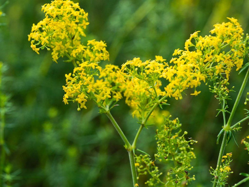 Echtes Labkraut - ein ausdauerndes Kraut aus der Familie der Rötegewächse (Rubiaceae), verbreitet im warmen bis gemäßigten Eurasien und in Nordwestafrika. In der Natur wächst es auf Wiesen, Steppenhängen, in lichten Gebüschen und an Wegrändern, oft auf Böden mit höherem Kalziumgehalt. Im Garten findet es Anwendung in Wiesen- und Prärieanpflanzungen, an Hängen und in Schotterflächen, wo es wie ein zarter gelber Nebel zwischen Gräsern wirkt. Es bildet schlanke Stängel, die aufrecht oder leicht überhängend sein können, und Blätter in zahlreichen Quirlen, schmal bis linealisch, mit leicht eingerolltem Rand, ohne Dornen. In voller Blüte ist es etwa 30–60 cm hoch, auf üppigeren Böden 80–100 cm, und breitet sich zu weichen Polstern aus. Von Juni bis August trägt es an den Stielenden dichte, verzweigte Rispen kleiner sternförmiger Blüten, die zart nach Honig duften. Nektar und Pollen werden von Bienen, Hummeln und Schmetterlingen gesucht. Die Pflanze ist bekannt für ihre traditionelle Verwendung beim Gerinnen von Milch bei der Käseherstellung, dank der Anwesenheit von Enzymen, die die Koagulation fördern. In Kompositionen lässt es sich gut mit Schwingel, Federgras, Salbei, Thymian, Schafgarbe oder trockenheitsliebenden Fetthennen kombinieren.