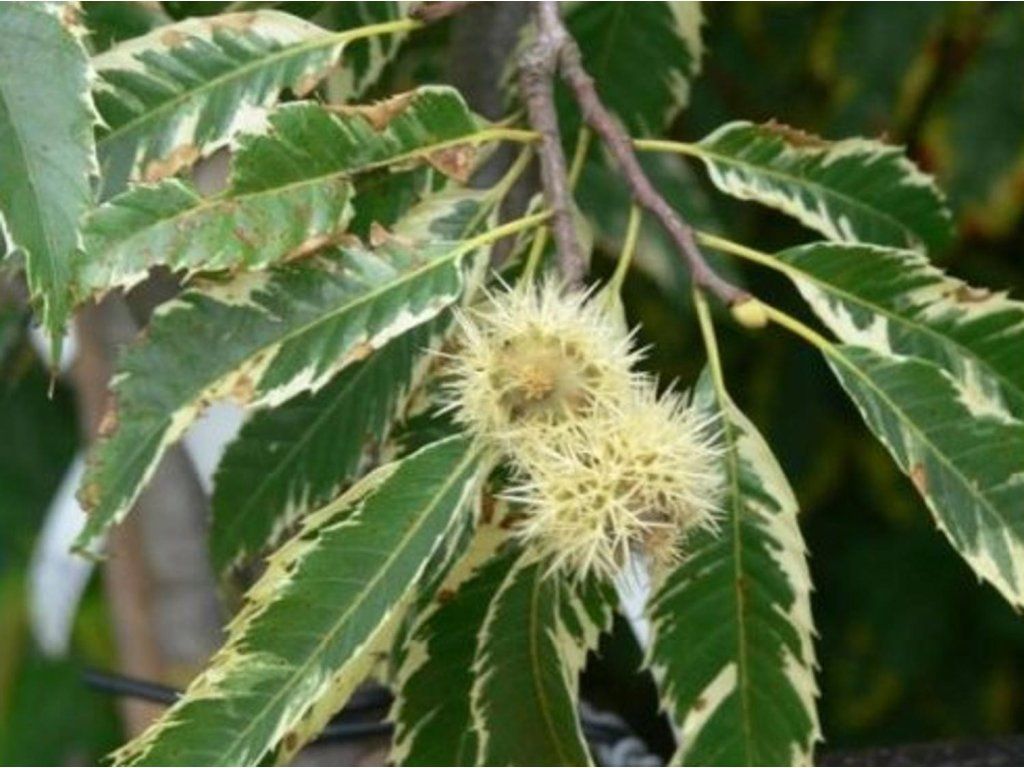 Edelkastanie 'Variegata' - eine Sorte, die je nach Anbaubedingungen standardmäßig eine Höhe von etwa 8 - 15 m erreicht. Sie zeichnet sich durch eine breite, eiförmige Krone aus. Die Rinde ist braun gefärbt, die Äste haben dann einen gräulichen Ton. Die Blätter sind länglich geformt, dunkelgrün, glänzend und am Rand unregelmäßig mit einem weißen bis cremefarbenen Farbton panaschiert. Die Ränder sind gesägt. Im Herbst färben sie sich tief goldgelb. Der Baum ist einhäusig, die männlichen Blüten sind weiß gefärbt. Die weiblichen sind klein, gelb-grün und nicht sichtbar interessant. Die Blütezeit ist im Juni und Juli. Die Früchte sind zu 2 - 3 angeordnet und befinden sich in einer stacheligen Hülle. Die Frucht ist eine Kastanie, die essbar ist. Sie reifen ab Mitte Oktober.