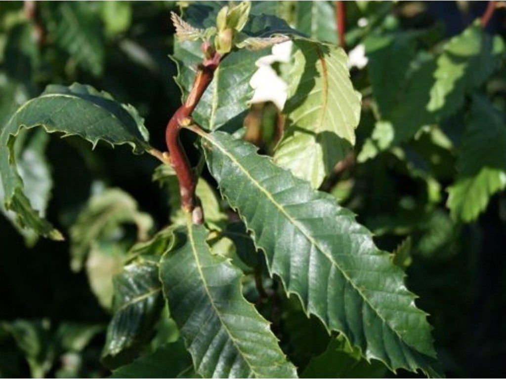Edelkastanie 'Vincent van Gogh' - eine Zwerg-, langsam wachsende Sorte, die im Erwachsenenalter eine Höhe von 1,5-3m und eine Breite von 1,2-2m erreicht. Die jährlichen Zuwächse betragen 5-10cm. Er zeichnet sich durch seine dekorativen, leicht verdrehten Zweige aus. Bei regelmäßigem Schnitt bildet er eine schöne, pyramidenförmige Krone. Die Blätter sind kleiner als üblich für die Art, schmal, unregelmäßig geformt, leicht gezähnt, in dunklerer grüner Farbe. Er blüht im Juni und Juli, die Blüten sind grün-weiß gefärbt. Die Früchte sind Kastanien, deren Ernte im Oktober beginnt. Die Sorte ist jedoch Fremdbestäuber und benötigt Bestäuber.
