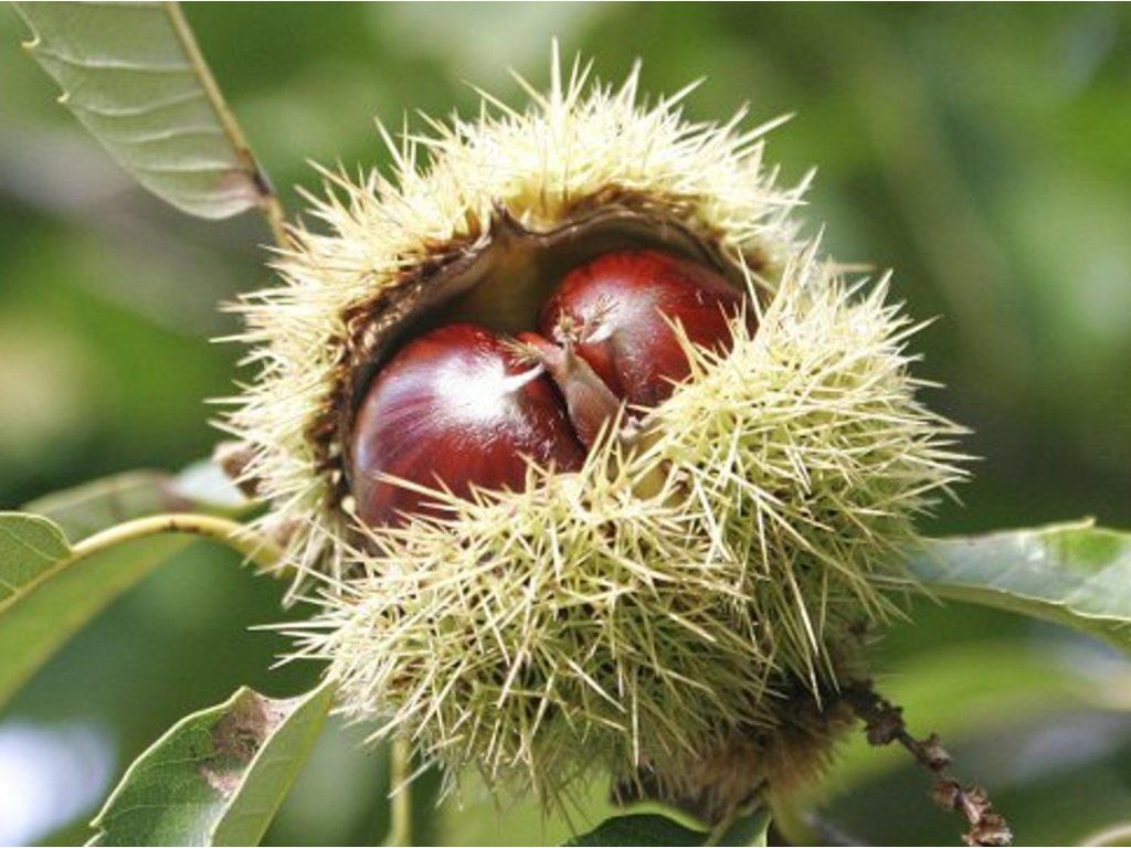 Edelkastanie - ein langlebiger Laubbaum aus Süd- und Kleinasien, wo er Teil von lichten Laubwäldern und Berghängen ist. Unter günstigen Bedingungen erreicht er eine Höhe von 20–25 m, in Gärten und Parks der Tschechischen Republik normalerweise etwa 12–18 m, mit einer breiten, gewölbten Krone von 8–12 m Breite. Der Stamm älterer Bäume hat eine tief gefurchte Rinde, die dem Baum einen ausgeprägten Charakter verleiht. Die Blätter sind länglich-lanzettlich, 10–20 cm lang, ledrig, mit scharf gesägtem Rand und nach vorne gerichteten Zähnen, auf der Oberseite glänzend dunkelgrün. Die Kastanie ist einhäusig, männliche und weibliche Blüten erscheinen an einem Baum. Von Juni bis Juli trägt sie auffällige, cremegelbe Kätzchen von bis zu 15 cm Länge, wobei die weiblichen Blüten an deren Basis sitzen. Die Blüten werden durch Wind und Insekten bestäubt, aber die Art ist nicht vollständig selbstfruchtbar, daher wird für eine sichere und reiche Fruchtbildung die Pflanzung von mindestens zwei genetisch unterschiedlichen Individuen oder verschiedenen Kultivaren empfohlen. Die Früchte sind glänzend braune Nüsse, zu zweit oder zu dritt in einem dicht stacheligen Fruchtbecher eingeschlossen, der im Oktober während der Reifung aufplatzt. Unter den wärmeren Bedingungen der Tschechischen Republik reifen Kastanien normalerweise vom Anfang bis Ende Oktober. Der fleischige Samen hat einen leicht süßlichen, mehligen Geschmack, der nach der Wärmebehandlung Speisen verfeinert und aromatisiert. Esskastanien gehören zu den traditionellen Rohstoffen der mediterranen Küche, sie werden geröstet, gekocht oder zu Püree, Desserts und Kastanienmehl gemahlen verwendet. Frische Früchte haben einen hohen Anteil an Stärke, Ballaststoffen, Vitamin C und B-Vitaminen sowie Kalium und Magnesium, weshalb sie zu den ernährungsphysiologisch wertvollen Früchten gezählt werden, die als Teil einer abwechslungsreichen Ernährung geeignet sind.