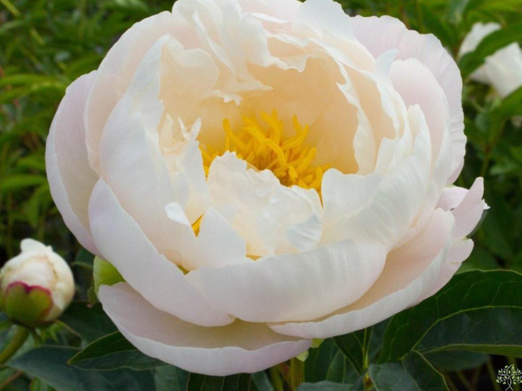 Pfingstrose 'Miss America' - Die Sorte 'Miss America' wurde von Mann und van Steen gezüchtet und 1936 auf den Markt gebracht, später erhielt sie eine Auszeichnung der American Peony Society. Sie bildet einen ausdauernden, gut belaubten Horst von etwa 80–110 cm Höhe und 80–100 cm Breite, der viele Jahre am selben Standort ohne Vitalitätsverlust bestehen bleibt. Die Blätter sind tief geteilt, sattgrün und bleiben bis zum Herbst dekorativ. Ende Mai und Anfang Juni öffnen sich große, halbgefüllte Blüten von meist 15–20 cm Durchmesser. Die Knospen sind meist zartrosa, bei der Blüte verfärben sich die Blüten weiß und die Mitte wird durch einen Kranz goldgelber Staubgefäße betont. Die Stiele tragen oft auch Seitensprossen, sodass der Blüteffekt kein einmaliges Ereignis ist und je nach Wetterlage etwa 7–12 Tage dauert. Der Duft ist süßlich, bei warmem Wetter deutlicher. Die offenere Mitte ist für Bienen und Hummeln gut zugänglich und die stabilen Stiele ermöglichen auch die Verwendung als Schnittblume, in der Vase hält sie normalerweise etwa eine Woche. In Kompositionen lässt sie sich natürlich mit Schwertlilien, Salbei, Storchschnäbeln, Katzenminze, Akelei und feinen Ziergräsern kombinieren, wo die weiße Farbe einen ruhigen Akzent zu Beginn des Sommers setzt.