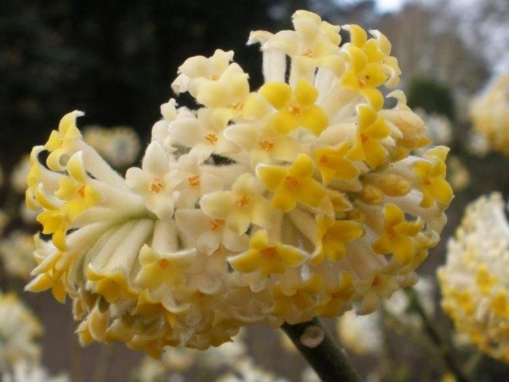 Edgeworthia- Syn. Papierstrauch. In Gärten der gemäßigten Zone bildet sie einen laubabwerfenden Strauch bis kleinen Baum, der unter mitteleuropäischen Bedingungen üblicherweise 1,5–2 m hoch und etwa 1,5–2,5 m breit wird. Junge Pflanzen haben eher eine aufrechte Wuchsform, später bildet die Krone eine locker ausgebreitete, weiche, abgerundete Form. Glatte Äste in olivfarbenen bis graubraunen Tönen tragen große, lang gefiederte Blätter von etwa 40–60 cm Länge, die aus einer Reihe schmalerer, 7–15 cm langer Blättchen bestehen. Die Belaubung wirkt fast subtropisch, im Frühling treibt sie frischgrün aus, im Sommer ist sie mittel- bis dunkelgrün und im Herbst färbt sie sich gelb bis gelb-orange. Die größte Zierde sind die Winter- und frühen Frühlingsblüten – an den Triebspitzen bilden sich vom Spätwinter bis März oder April dichte, kugelförmige Köpfe aus kleinen gelben Blüten, die außen silbrig filzig sind. Die Blüte duftet stark, ist eine reiche Quelle für Nektar und Pollen für Bienen und andere Bestäuber zu einer Zeit, in der nur wenige Gehölze im Garten blühen. Die Rinde der Edgeworthia gehört traditionell zu den Rohstoffen für die Herstellung von japanischem Handpapier, und die Pflanze verbindet so ihren Zierwert mit einer interessanten Kulturgeschichte. In der Gartengestaltung kommt sie als seltene Solitärpflanze auf der Terrasse, im Vorgarten oder im Hintergrund von gemischten Strauchpflanzungen zur Geltung, wo sowohl die Winterblüte als auch die großen Blätter zur Geltung kommen.